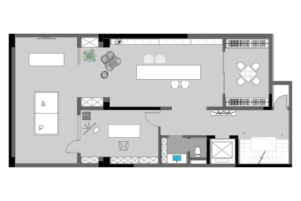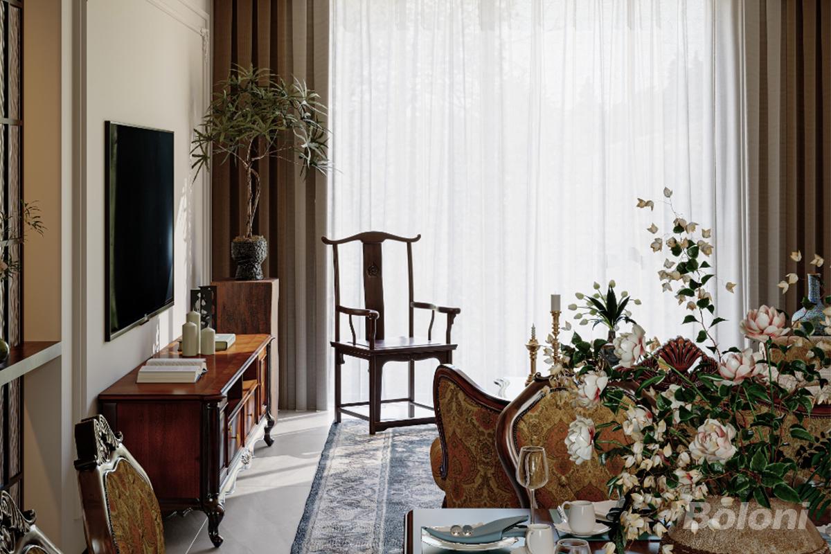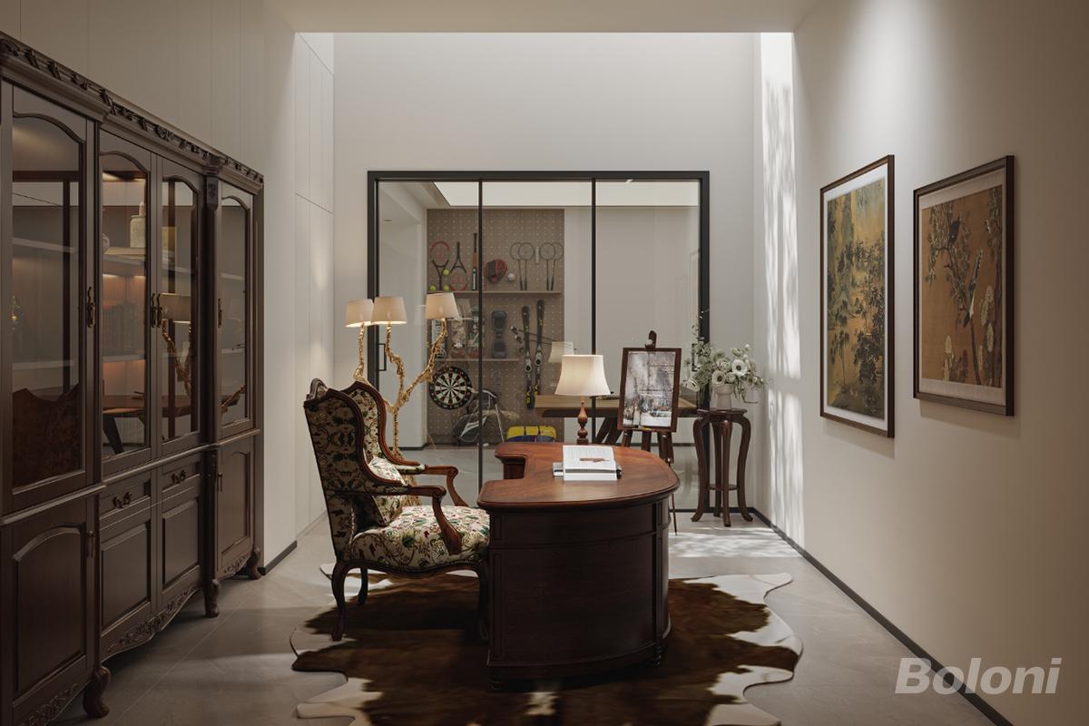 书房以复古雕花家具为核心,花纹座椅与弧形书桌强化优雅质感,玻璃柜陈列藏品兼具展示与收纳功能;背景玻璃门连通休闲区,既保障视线通透,又通过艺术挂画与花艺软装,营造出 “闹中取静” 的办公氛围。