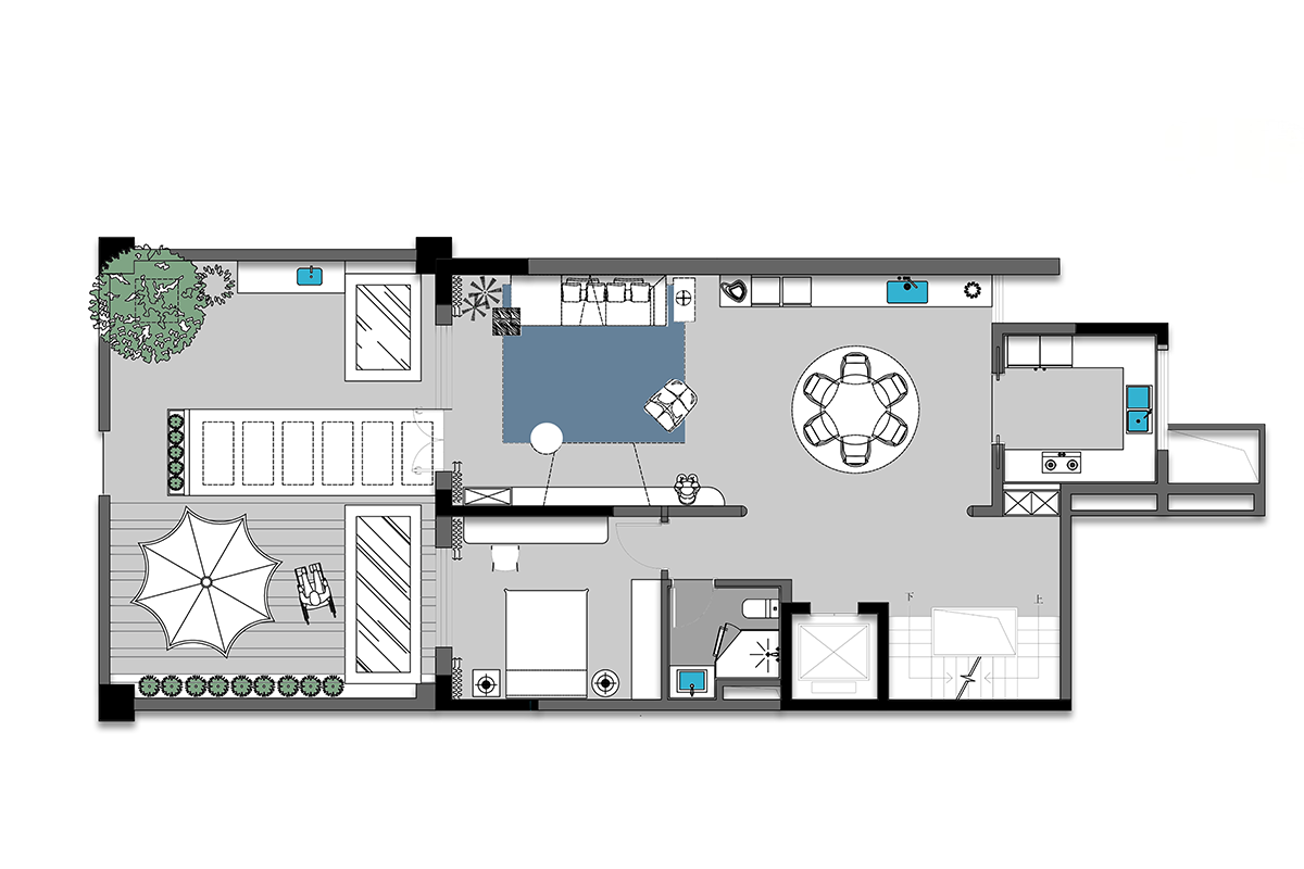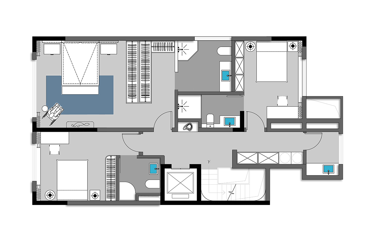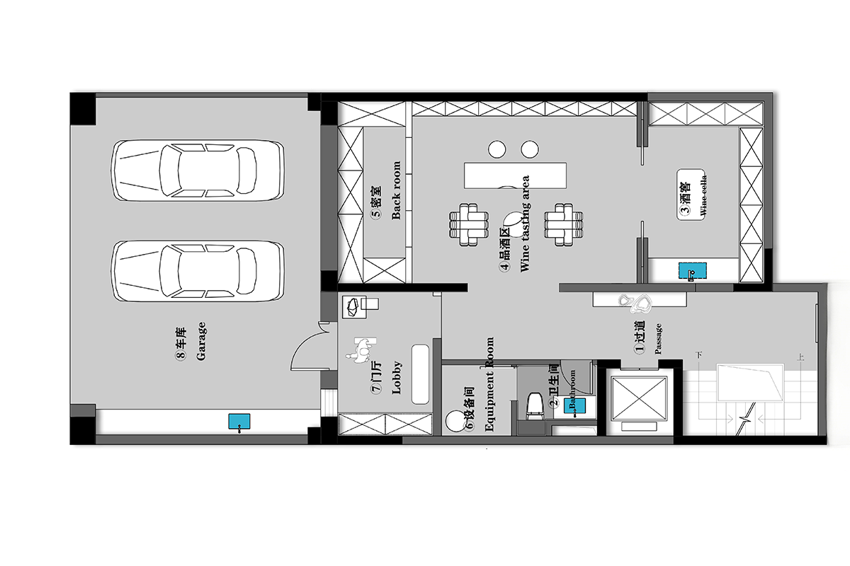 多层复式户型,功能分层清晰:一层为餐客厨 + 露台,满足日常起居与社交;二层是双卧室(含衣帽间)+ 双卫浴,主打私密休憩;另有休闲层(含办公、互动区)与地下层(酒窖、品酒区、车库等),空间配置完善,公私分区明确,适配多元生活需求。