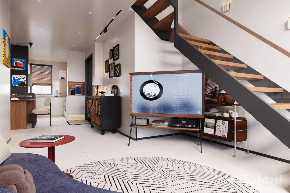 从沙发侧方视角拍客厅,楼梯下方打造出影音区,木质框架的开放式电视柜上摆放大屏电视(显示音乐播放界面)与复古影音设备;背景可见餐厨区的艺术装饰与色彩鲜明的挂画,工业风的金属楼梯与复古软装碰撞,凸显空间的混搭艺术感。