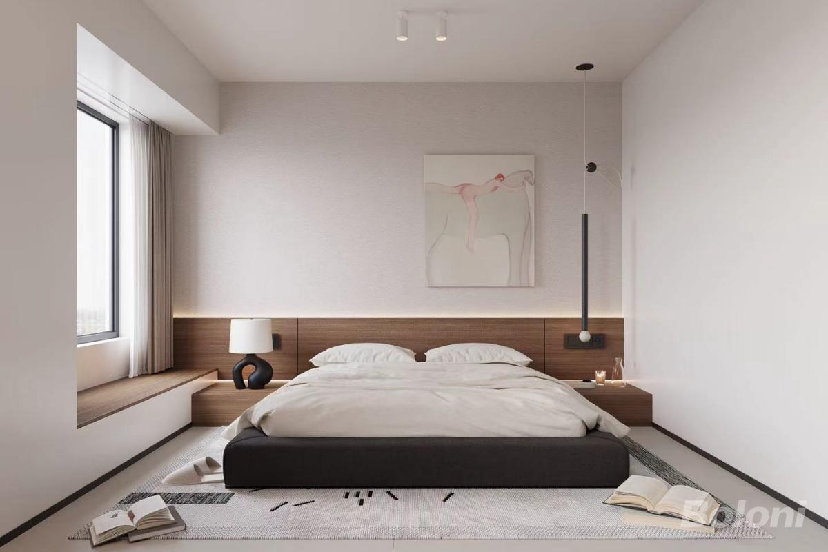 特写卧室区域,浅灰色肌理墙面搭配木质床头背景,悬浮床头柜与极简线条的吊灯营造出静谧感;白色床品搭配黑色床架,窗边飘窗延伸出休闲角落,地面纹理地毯与翻开的书籍增添生活气息,整体风格简约又温馨。
