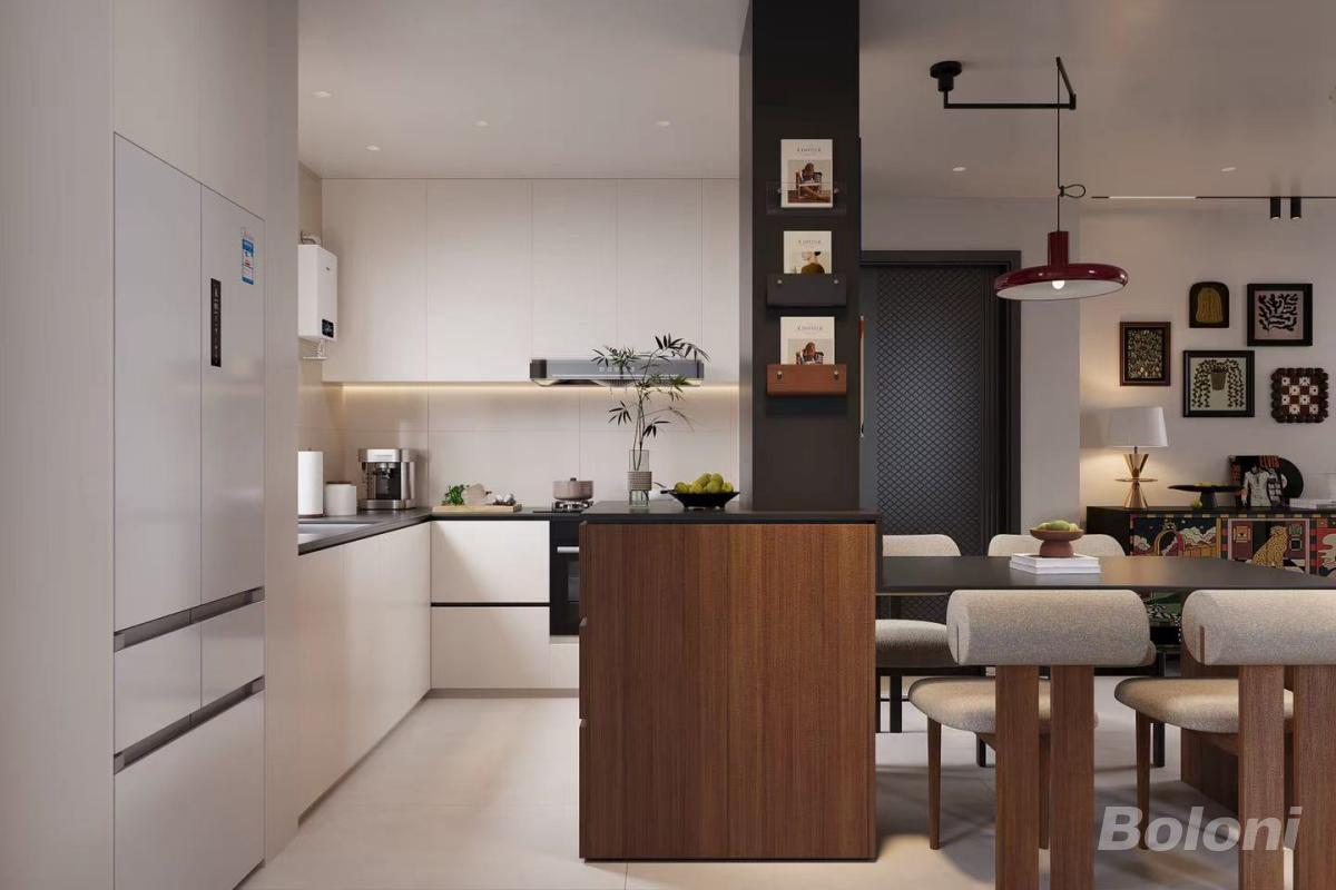 呈现餐厨一体化空间,以白色哑光橱柜搭配深色台面,木质中岛台形成视觉过渡;餐区摆放木质餐桌与布艺餐椅,墙面挂有复古装饰画,红色吊灯成为撞色亮点;黑色立柱做了开放式展示设计,嵌入装饰卡片,让功能性的餐厨区兼具美学与个性。