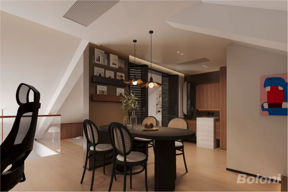 呈现复式二层的餐区空间,利用斜顶结构做层次化设计。黑色金属框架搭配藤编元素的餐椅,围绕黑色圆形餐桌摆放,木质地板温润柔和;墙面嵌入开放式展示格陈列装饰卡片,黑色百叶隔断柔化空间边界,艺术吊灯与抽象挂画增添复古艺术感;左侧可见办公椅,暗示餐区旁兼具轻办公功能,实现空间的复合利用。