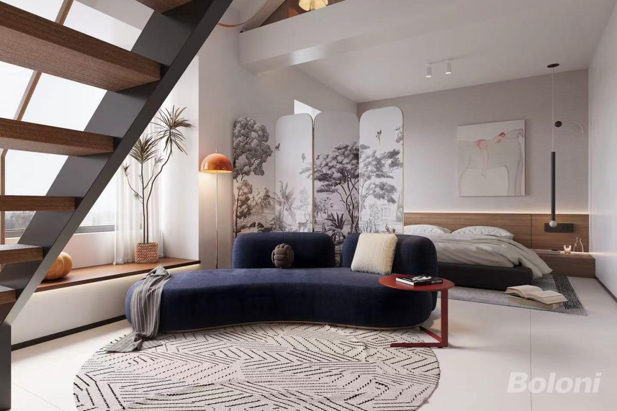 视角拉宽,展现客厅与卧室的开放式联动布局。楼梯旁的深蓝色沙发衔接后方的卧室区域,床头背景墙为浅灰色调,搭配简约艺术挂画与悬浮木质床头板;屏风式水墨装饰隔断柔化空间边界,落地灯与窗边绿植延续了整体的自然与艺术感,开放式设计让小LOFT显得更通透。