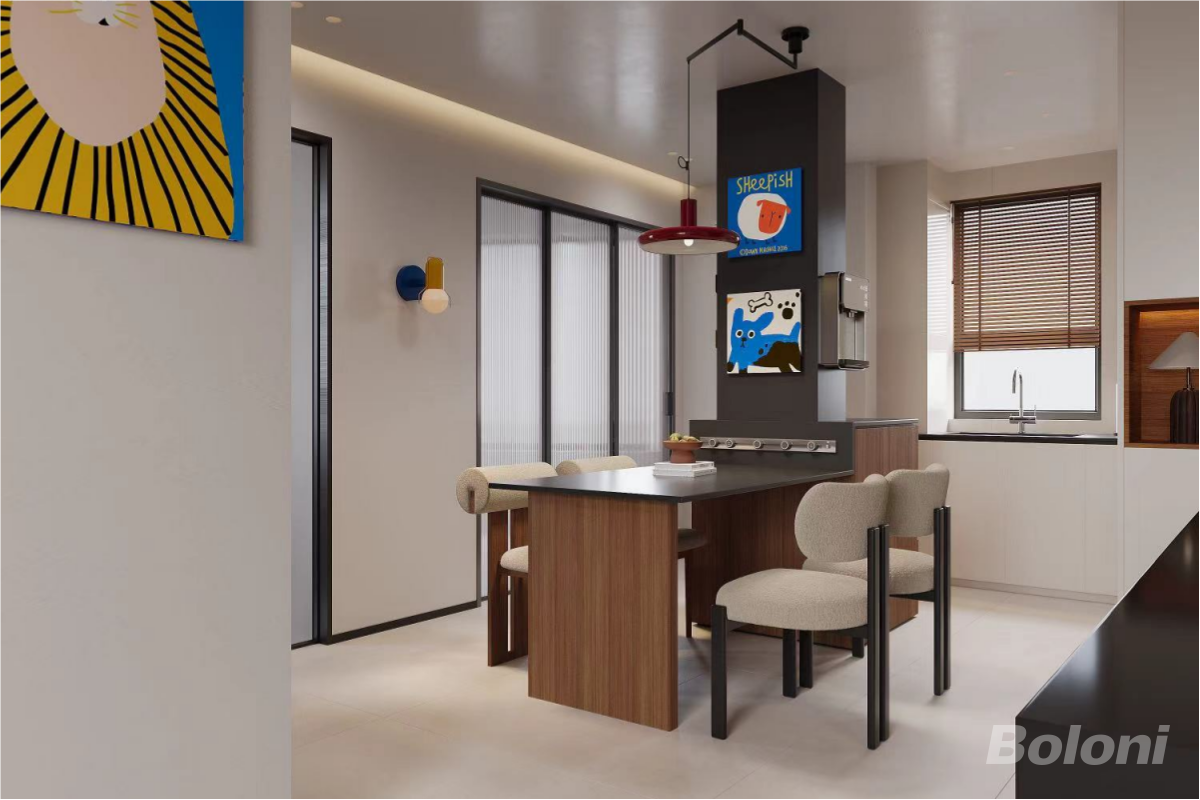 展示一层餐厨一体化核心区,以木质中岛台衔接厨房与餐厅。浅米色布艺餐椅搭配黑色金属支架,与木质中岛台形成材质碰撞;黑色立柱嵌入彩色艺术装饰画,红色吊灯成为视觉焦点,白色橱柜与木质台面结合,百叶窗过滤自然光线,让餐厨区在实用的同时,通过色彩与材质混搭凸显设计感。