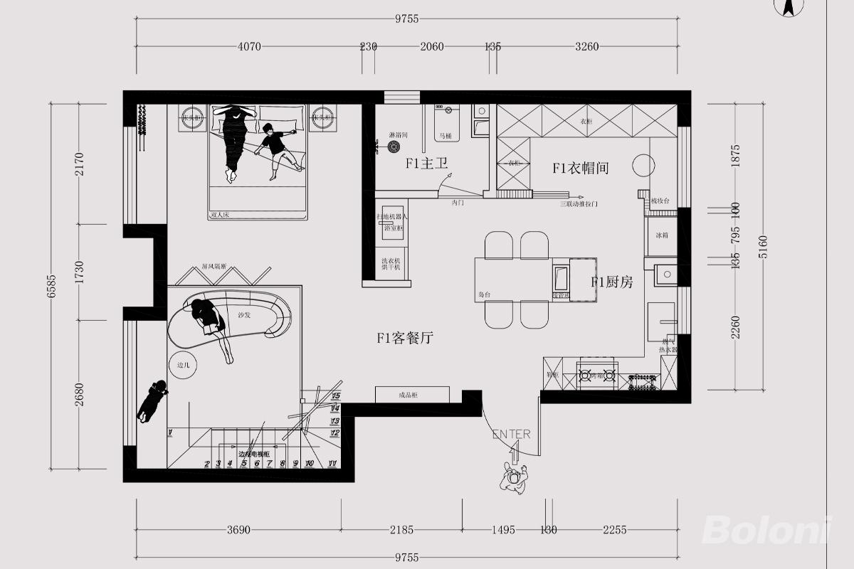 这是一套复式住宅的一层(F1)平面布局图,整体为长方形户型,以客餐厨一体化为核心,结合动静分区原则规划功能区,细节设计兼顾实用性与空间利用率。 私密区:户型北侧规划主卧+主卫+独立衣帽间的套间组合,衣帽间采用三联动推拉门设计,主卫配备淋浴、马桶与洗漱区,形成完整的私密居住空间; 公共区:户型中南部为客餐厅+厨房的开放式公共区,入户直达客餐厅核心,厨房紧邻餐厅,动线流畅且空间通透。