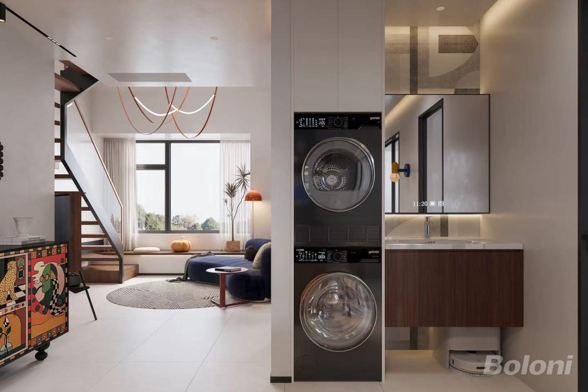 聚焦入户旁的家政功能区与客厅联动视角。白色柜体嵌入叠放的洗烘一体机,旁侧打造洗手台与收纳柜,下方预留扫地机器人机位,实现家政功能的集约化布局;背景可见客厅的深蓝色弧形沙发、艺术吊灯与大窗,工业风楼梯的木质踏板与金属框架形成视觉延伸,彩色艺术柜体成为空间撞色亮点,让家政区与休闲区自然衔接又各具特色。