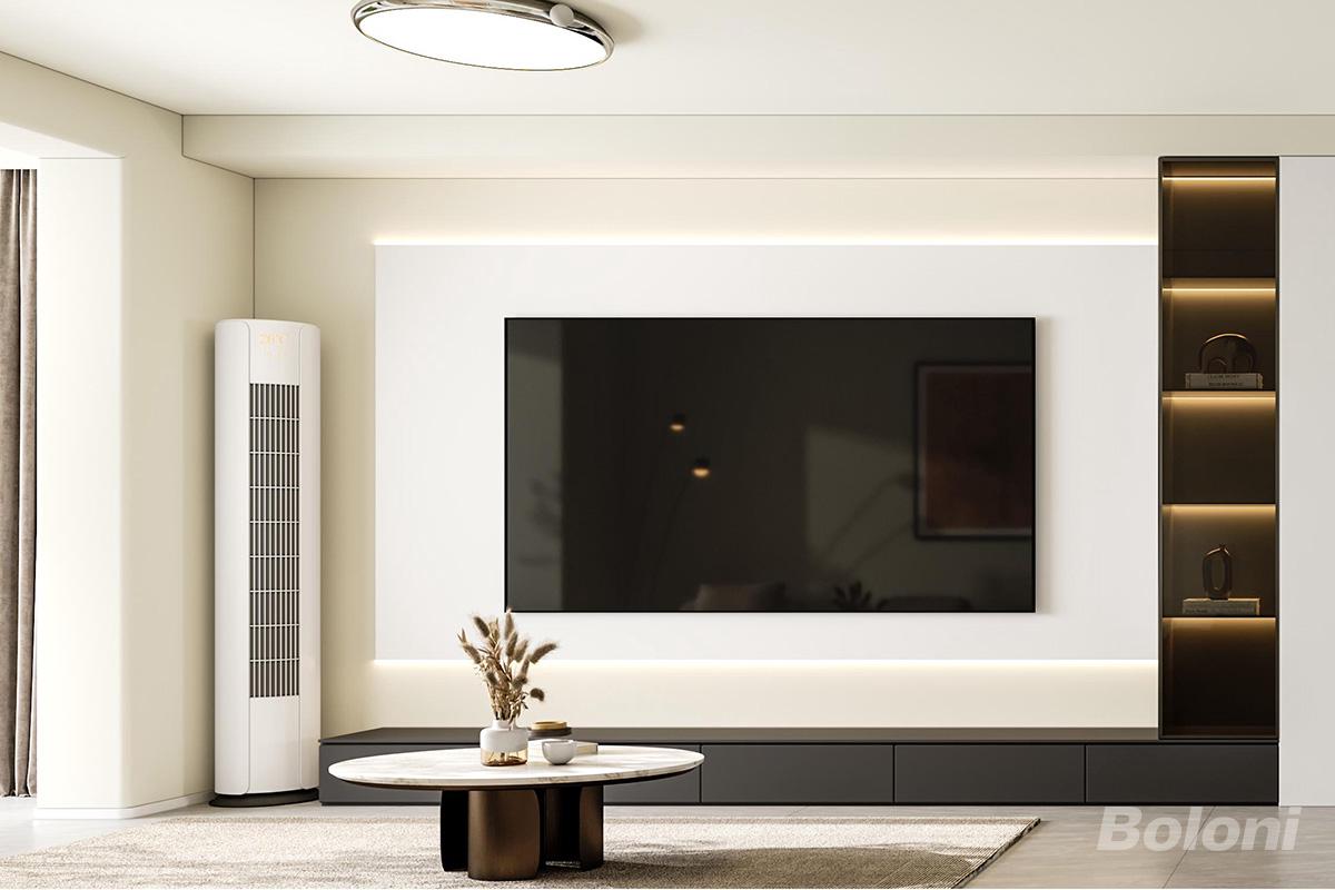 这是现代简约风客厅的电视墙区域,以米白为基底,搭配深灰地台柜,色调克制高级。电视墙嵌入氛围灯带,右侧暗藏发光展示柜,兼具收纳与陈列功能。圆形石纹茶几与柔光地毯柔化空间,极简软装与光影结合,营造出松弛又精致的起居氛围。