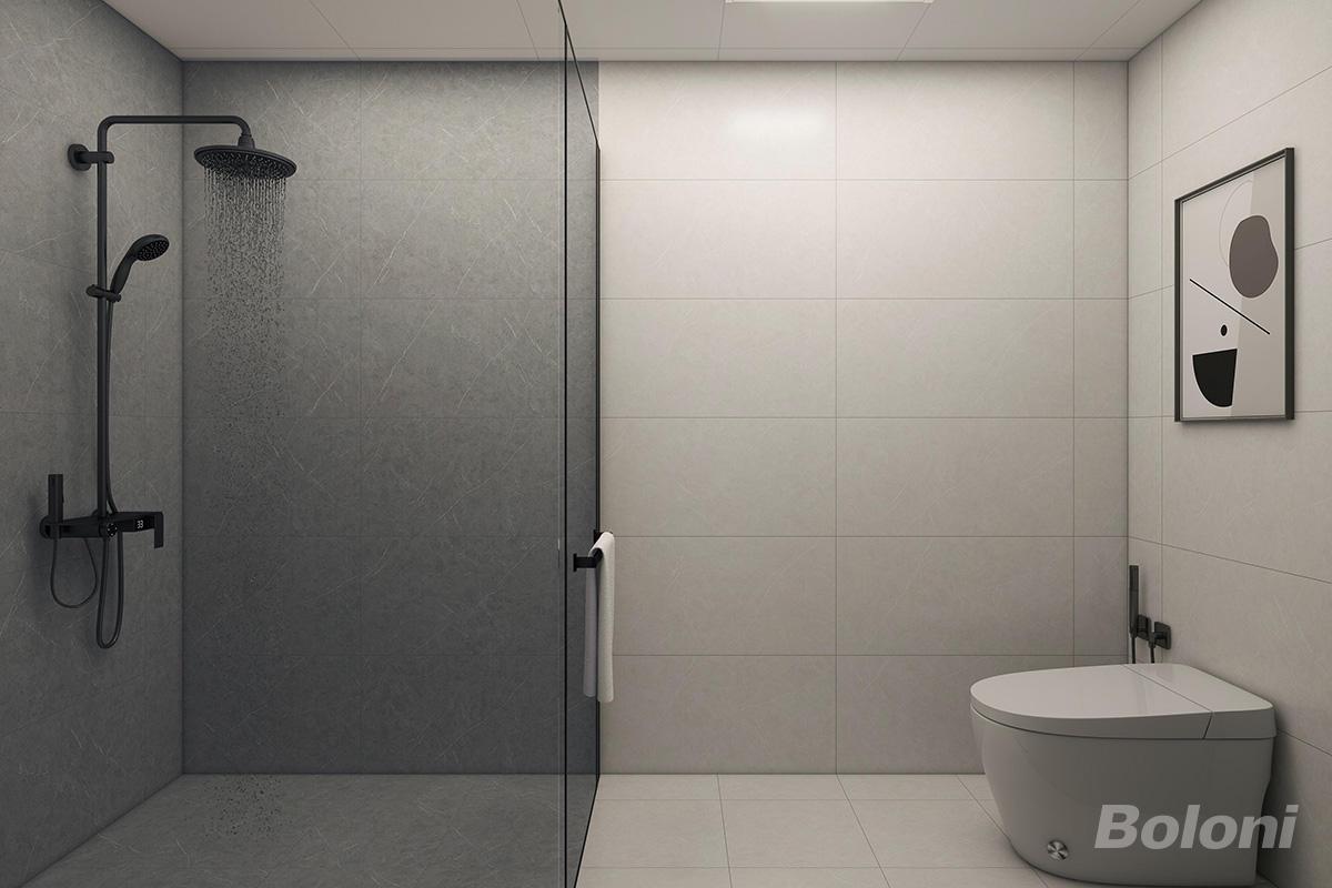 这是极简风卫浴间,采用灰白双色调分区:淋浴区以深灰石纹砖搭配黑色五金,玻璃隔断实现干湿分离;如厕区用浅白砖衬出整洁感,智能马桶提升体验。几何装饰画点缀墙面,在功能分区中兼顾实用与简约质感,营造出冷静有序的洗漱氛围。