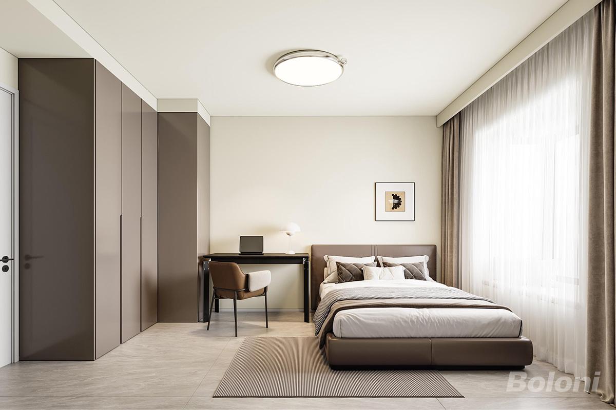 现代简约风卧室,以深棕、米白为主调:整面深棕衣柜扩容收纳,床具与柜体色调呼应,床侧嵌书桌兼顾轻办公。造型吊灯与几何画点缀,柔光透过纱帘倾入,在简洁线条中平衡实用与雅致,营造出松弛的休憩氛围。