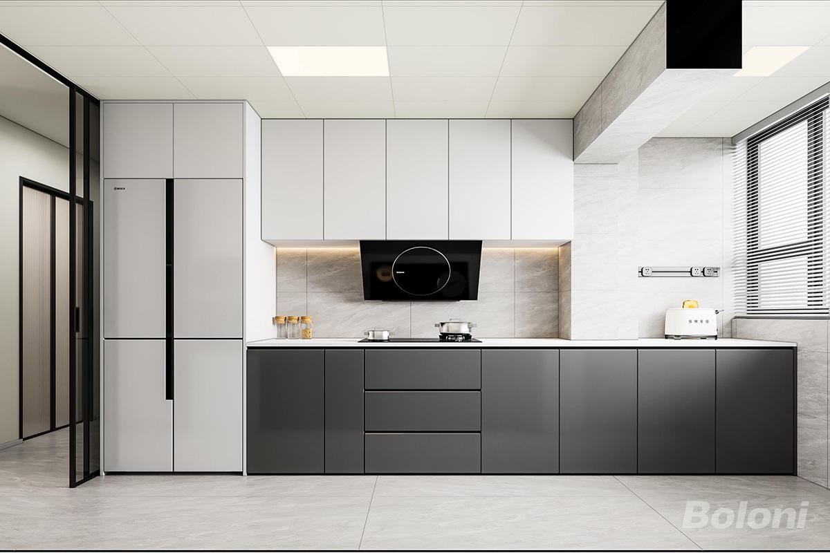 本厨房以现代极简美学为核心,采用灰白撞色打造利落视觉。上柜为浅白哑光面板,下柜用深灰质感柜体,搭配同色系石纹台面,色调克制且层次分明。双一字型布局划分功能区:一侧衔接嵌入式冰箱,另一侧预留小家电操作位,中间集成烟灶与抽屉收纳,动线高效流畅。暗藏式灯带嵌入吊柜下沿,与顶部平板灯呼应,柔化空间的同时强化氛围感。整体设计以简洁线条、一体化收纳与明暗层次,平衡实用与高级质感,适配现代烹饪的高效与审美。