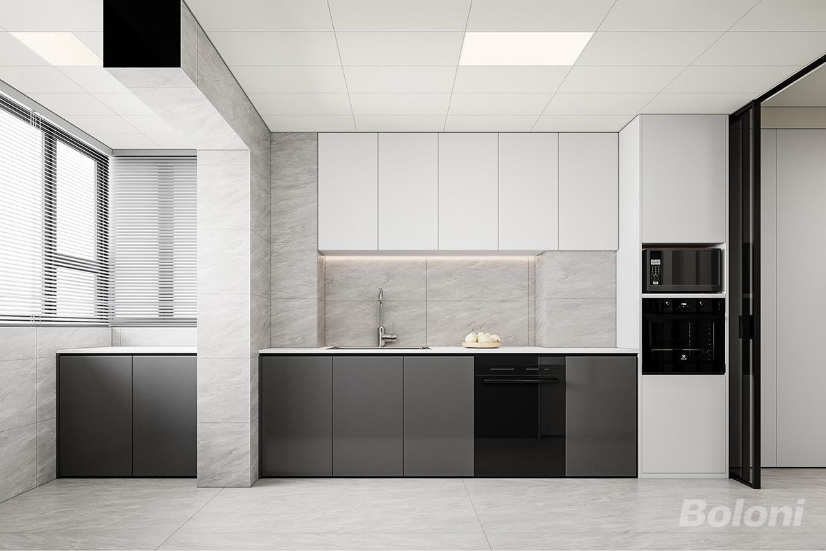 浅白哑光吊柜与深灰质感下柜形成视觉层次,搭配石纹台面与墙面,色调统一且质感细腻。布局采用双一字型延伸,中间集成水槽、洗碗机,右侧高柜嵌入微波炉与蒸烤箱,左侧台面预留操作区,动线清晰高效。 吊柜下沿的暗藏灯带与顶部平板灯呼应,柔化空间的同时强化氛围感;玻璃推拉门既保持通透,又能隔绝油烟。整体设计将收纳与厨电隐形嵌入空间,在简洁线条中实现实用与美学的平衡。