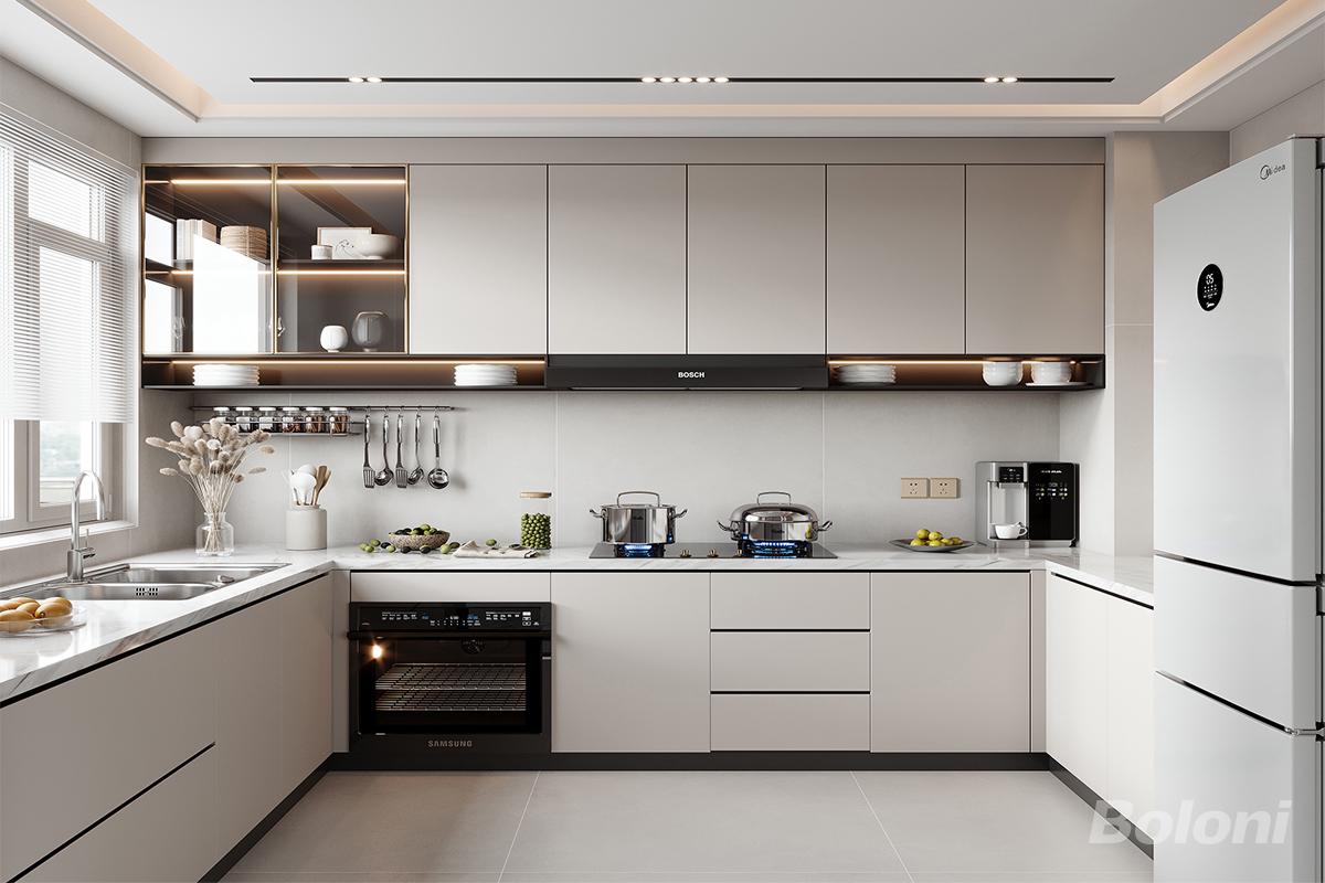 厨房采用L型橱柜设计,最大限度满足洗,切,炒的操作空间,通过吊柜镂空加玻璃柜门加灯带设计提高整体空间设计