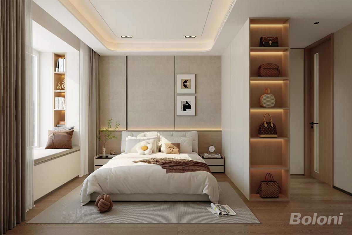 主卧设计以安静舒适的浅木色为主,整体氛围自然柔和,利用衣柜对卫生间门口进行遮挡,柜体侧面开放格用于展示与储物,床头通过增加灯条设计为整体空间增加氛围感,利用飘窗作为阅读角打造休闲与学习一体的休息空间