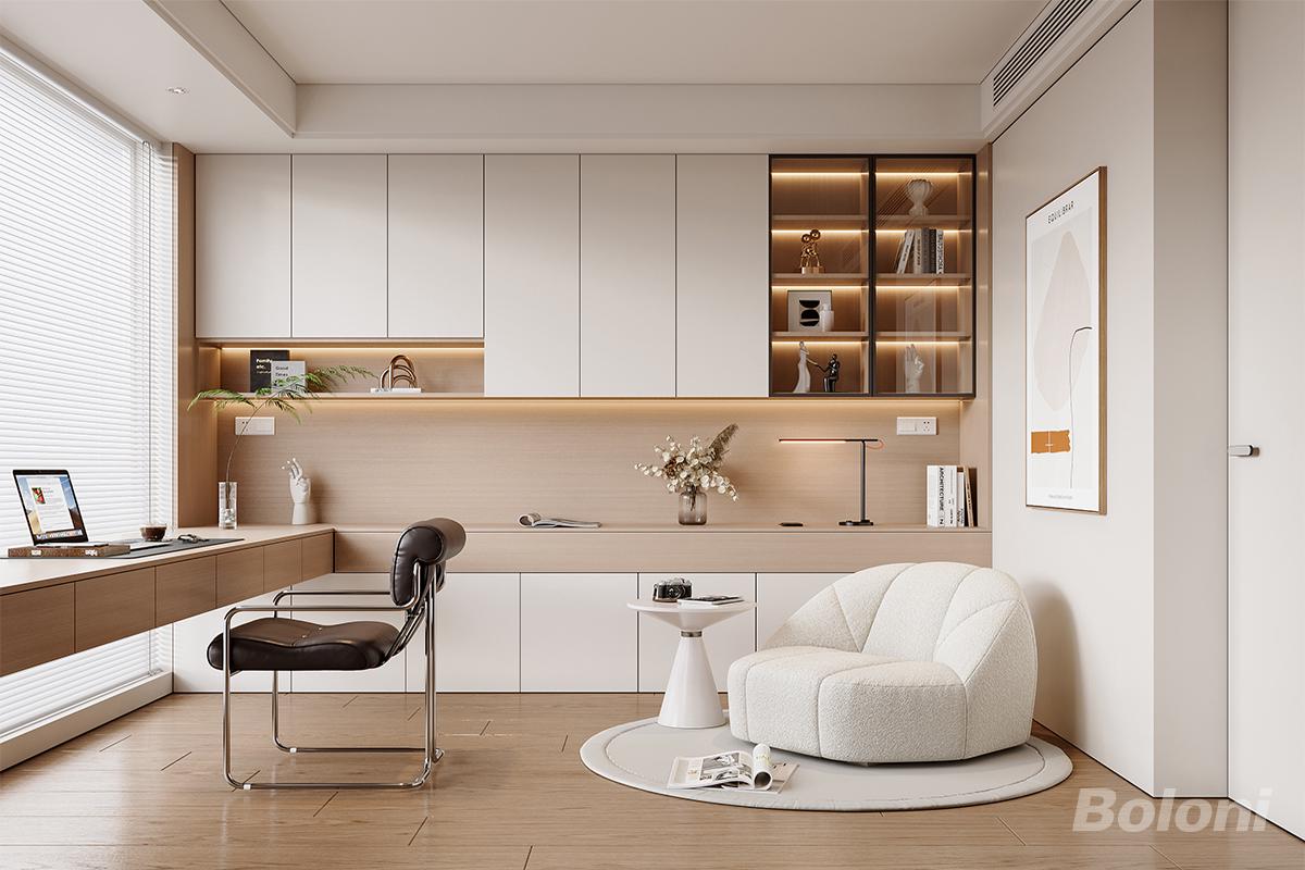 书房整体色调以奶白哑光加浅木色为主,采用长条书桌靠窗户加单人沙发设计,书柜采用开放格加玻璃门内部加灯带设计,方便取物和物品展示