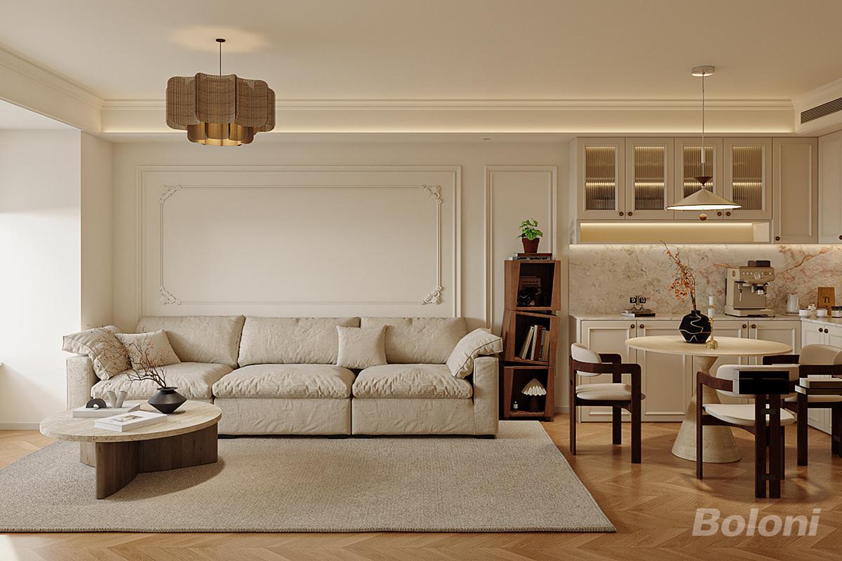 以奶油白为基底,用石膏线雕花、暖光氛围灯勾勒轻法优雅;材质上融合软糯布艺(沙发)、温润木作(书架)、自然石纹(餐区墙面),弱化硬质边界;同时将咖啡区嵌入餐厨,让精致美学与日常烟火共生,既保留轻法的仪式感,又以松弛的软装形态,构建 “可慵懒休憩、可轻享食光” 的生活场域。