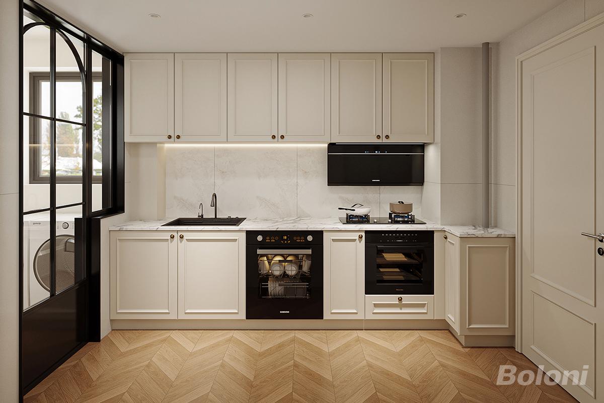 以奶油白橱柜 + 柔纹石台面铺陈轻法温柔,弧形黑框玻璃门打破空间沉闷,同时强化通透感;将嵌入式厨电与收纳整合,在优雅形态下兼顾操作效率;暖光氛围灯与自然肌理材质呼应,让厨房既保留轻法的精致质感,又以实用布局适配日常烹饪,实现 “美学颜值” 与 “烟火功能” 的平衡。