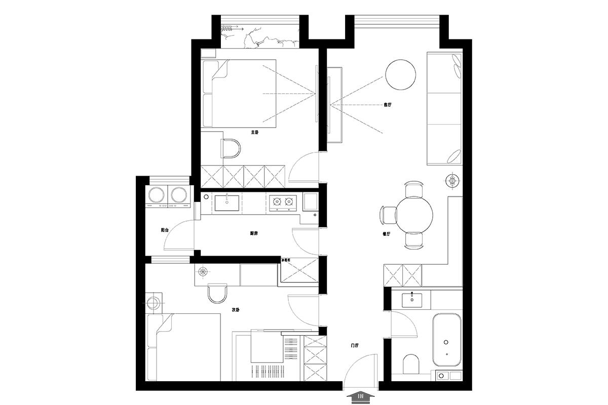 该户型动线清晰,建议:1. 主卧与客厅间做隔音处理,提升休憩私密性;2. 厨房利用台面延伸做小型餐吧,增加操作空间;3. 次卧可设折叠床 + 收纳柜,兼顾客卧与储物功能;4. 玄关加鞋柜,优化入户收纳。