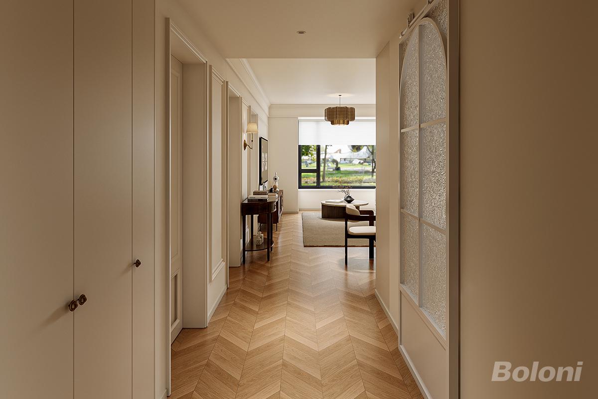 以 “轻美序章・洄游动线的温柔过渡” 为核心,将走廊打造成空间的柔润衔接场域。用奶油基底 + 人字拼木地铺陈温馨基调,以石膏线、复古壁灯植入轻法细节;右侧浮雕玻璃隔断既保障采光,又柔化空间边界;嵌入式柜体 + 边桌兼顾收纳与展示,让走廊从 “过渡通道” 转为兼具美学与实用的 “轻呼吸缓冲带”,自然串联各功能区的同时,传递松弛质感。