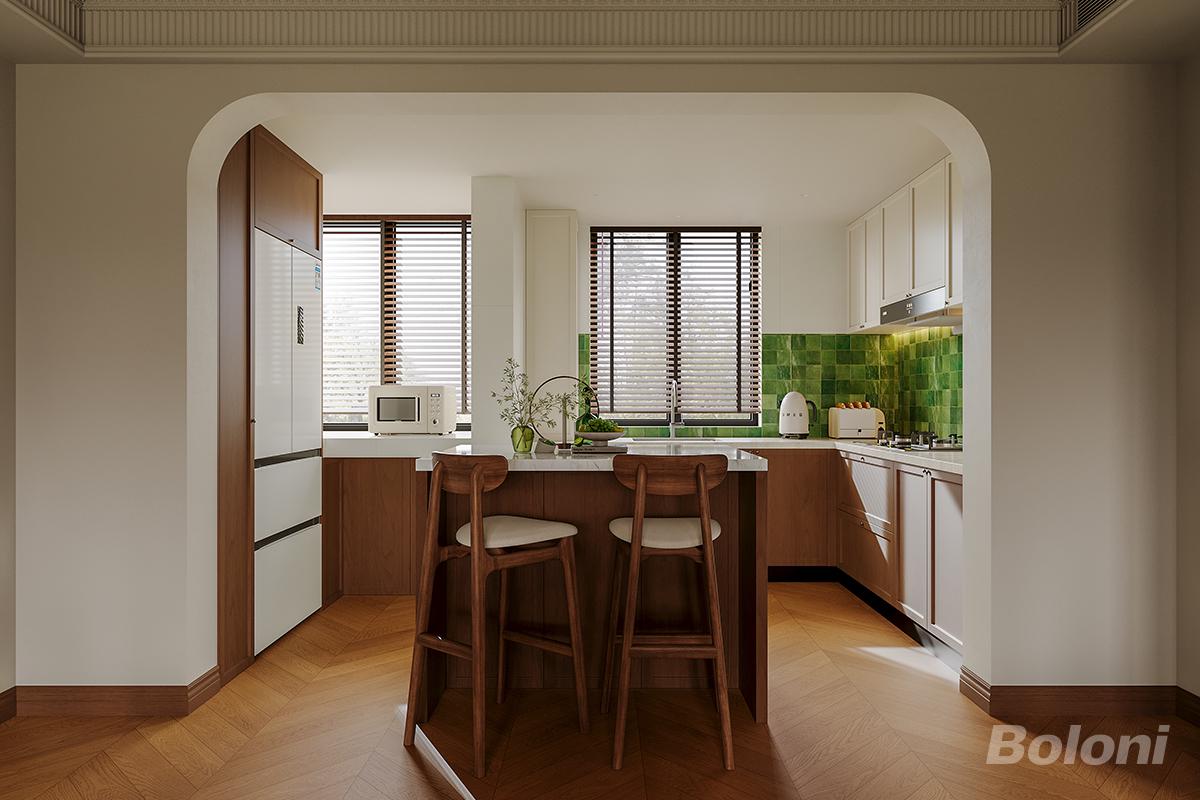 厨房以奶油白 + 温润木作铺陈轻法温柔,弧形门洞弱化空间边界,串联客餐区形成通透场域;绿色墙砖点缀烟火活力,岛台兼顾操作与社交功能,嵌入式厨电整合收纳;既保留轻法的精致质感,又以实用布局适配日常烹饪,让厨房成为 “美学与功能平衡” 的生活烟火地。