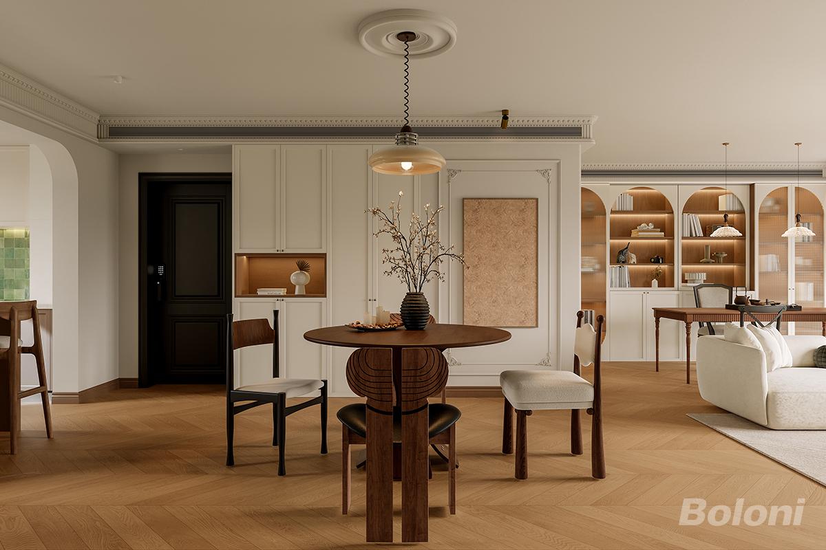 餐区以奶油基底 + 人字拼地板铺陈温柔氛围,用石膏雕花、复古灯具植入轻法优雅;通过嵌入式柜体整合收纳与展示,圆润木质餐桌搭配柔质座椅,平衡美学仪式感与用餐舒适度;同时以通透布局串联客厨,让餐区既是食光社交地,也是空间美学的柔润衔接点。