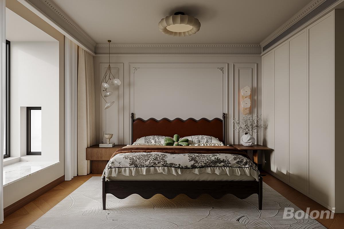 主卧室以奶油基底 + 石膏雕花勾勒轻法优雅,通顶柜整合收纳弱化空间压迫感;用复古软包床、柔纹床品传递温润质感,弧形灯具与自然软装点缀松弛氛围;同时借飘窗拓展休憩角落,让卧室既是精致美学的私域展示区,也是卸下疲惫的温柔治愈地。
