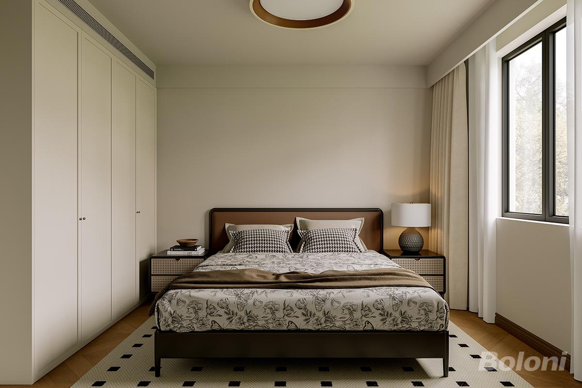 次卧室以奶油基底 + 通顶柜弱化空间压迫,用复古格纹床品、藤编床头柜植入轻法细节,柔质软装平衡精致与松弛;借低饱和配色与暖光氛围,让空间剥离冗余装饰,成为兼具收纳实用与温柔治愈的私域休憩地。