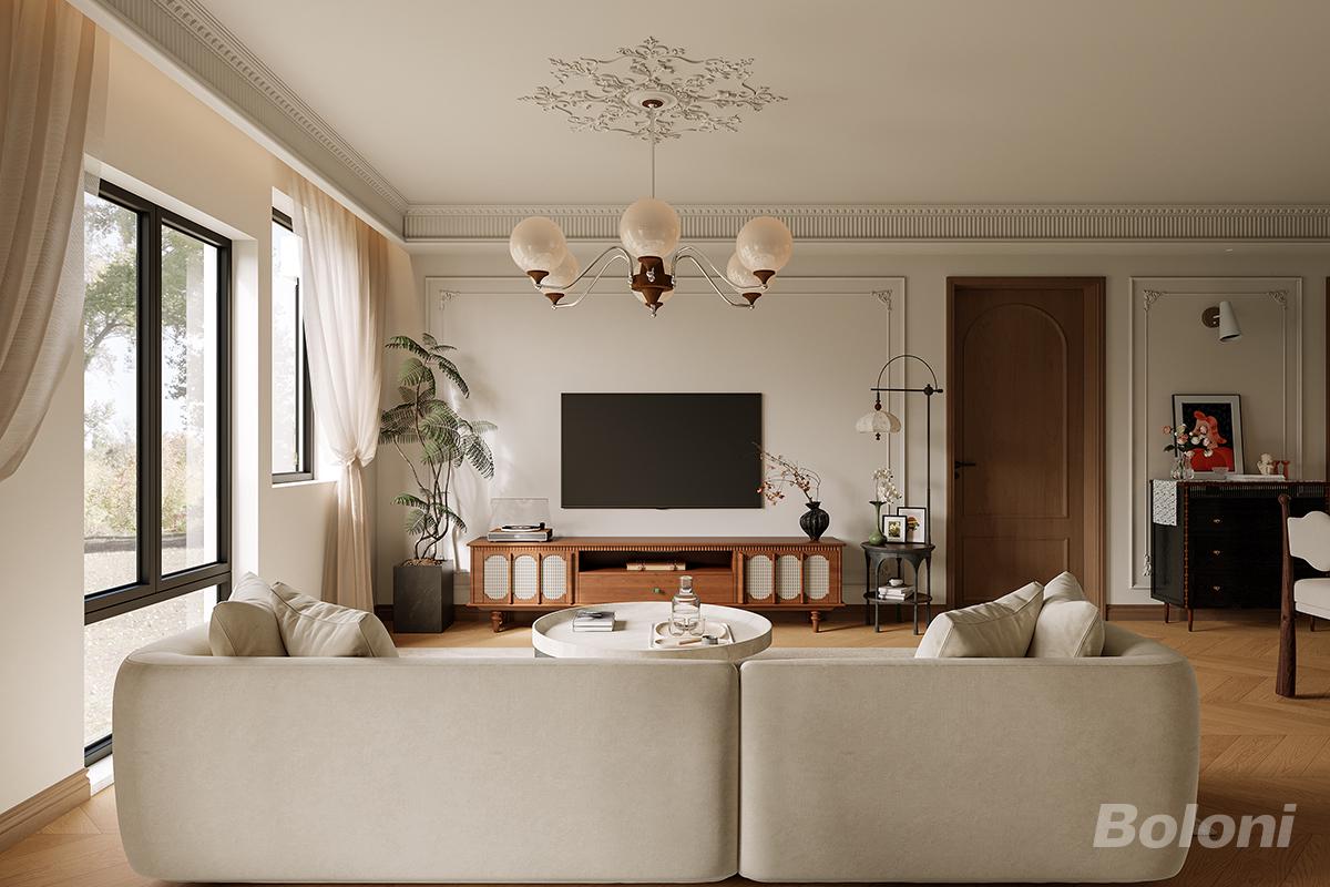 客厅以奶油基底铺陈温柔基调,用人字拼地板、石膏雕花等轻法元素勾勒优雅轮廓;材质上融合软糯布艺(沙发)、温润木作(电视柜),搭配复古灯具平衡精致与松弛;通过圆润家具形态与自然软装,让空间既是美学展示场,也是可自在休憩的日常松弛地。