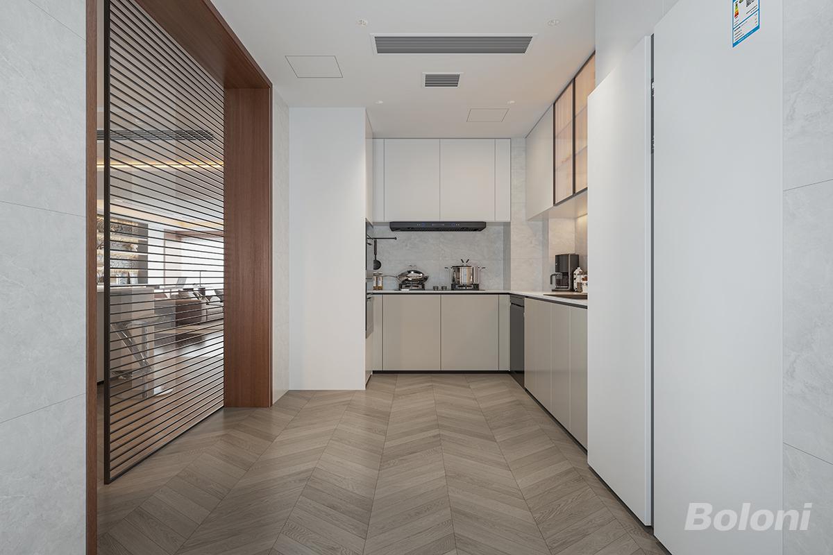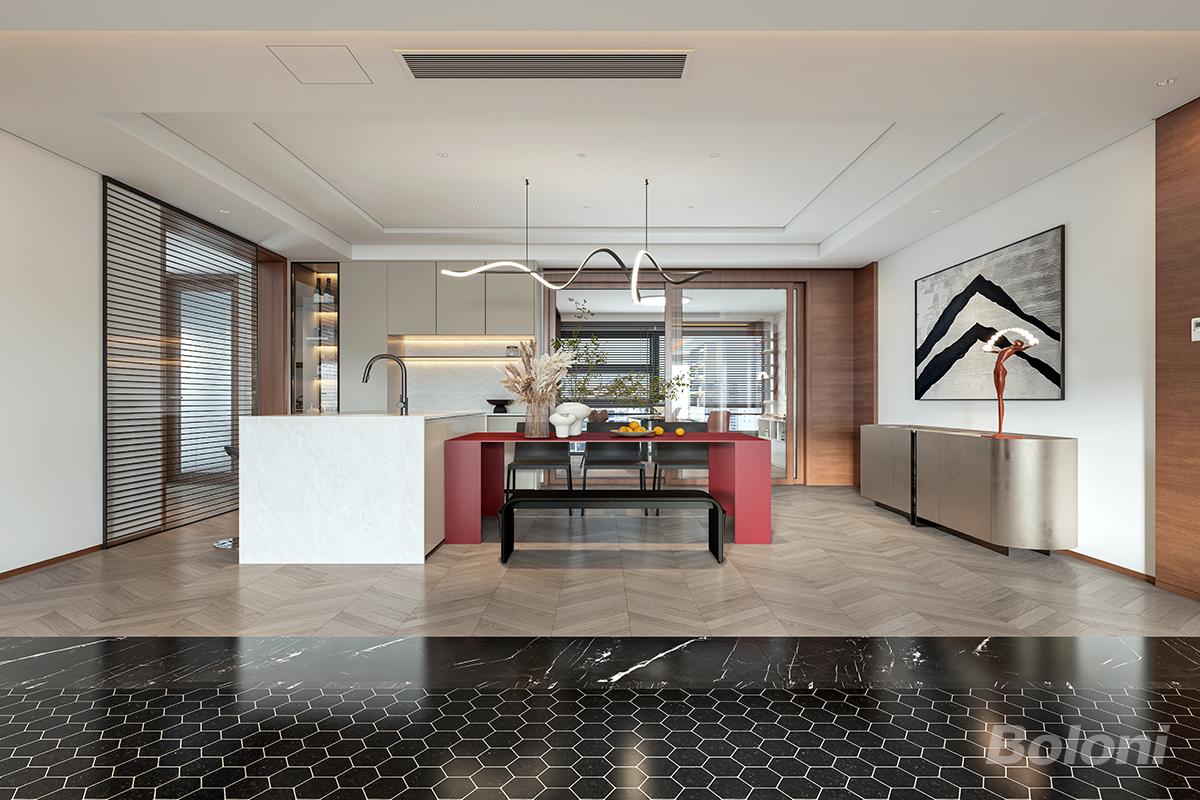 这是一个兼具现代感与艺术氛围的开放式餐厨空间,整体设计简约大气,又充满细节巧思。前景是带有白色纹理的黑色六角砖,与后方的人字拼木地板形成鲜明对比;白色岩板吧台、红色烤漆餐桌与金属质感的餐边柜相互映衬,营造出层次丰富的视觉体验。