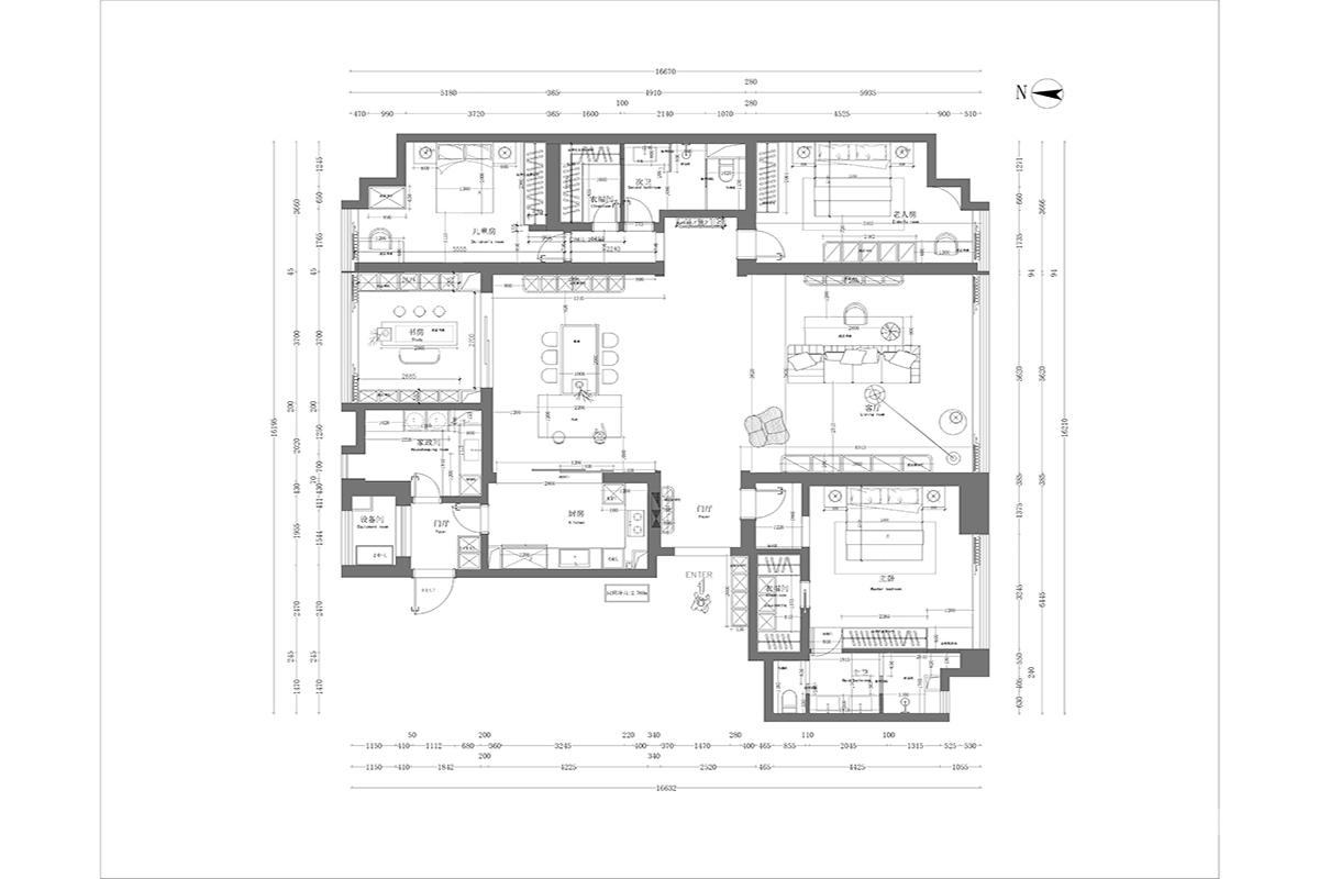 中央是超大的客餐厅一体化空间,动线流畅,是家庭活动与社交的核心。 四周分布着至少4间卧室(含1间带独立卫浴和衣帽间的主卧套房),保障居住隐私。 整体风格偏向现代简约,强调空间的通透感与功能性,适合追求舒适与品质的多人口家庭或改善型居住需求。