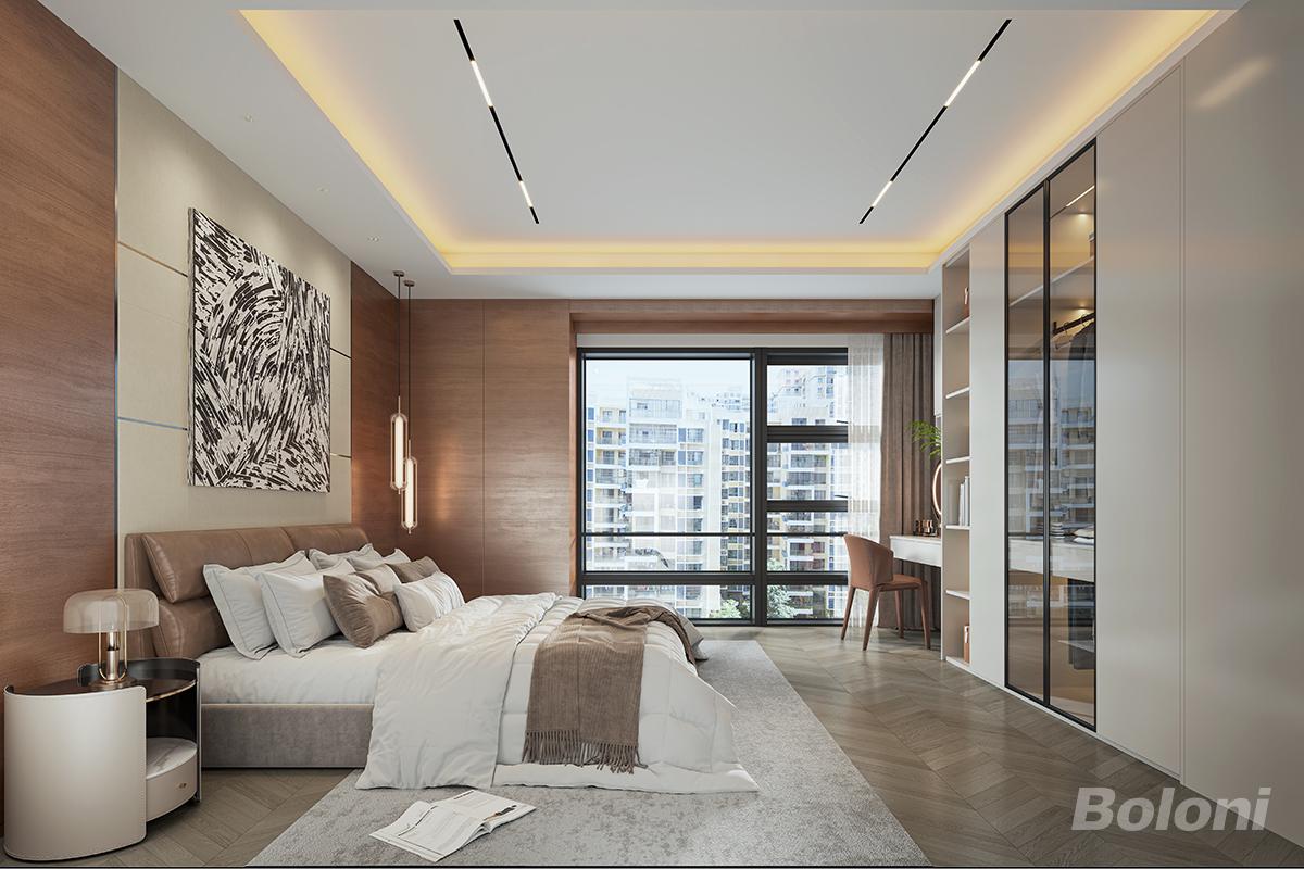 大面积落地窗引入充足自然光,纱帘与布帘的双层设计可灵活调节光线;顶部的悬浮吊顶与线性灯带,营造出层次丰富的光环境,让空间更显开阔与精致垂坠感的床头吊灯、肌理感的床尾毯,以及床边的简约床头柜,都在细节处提升了空间的品质感,让整个卧室既有大宅的尺度感,又不失温馨细腻的居家氛围。