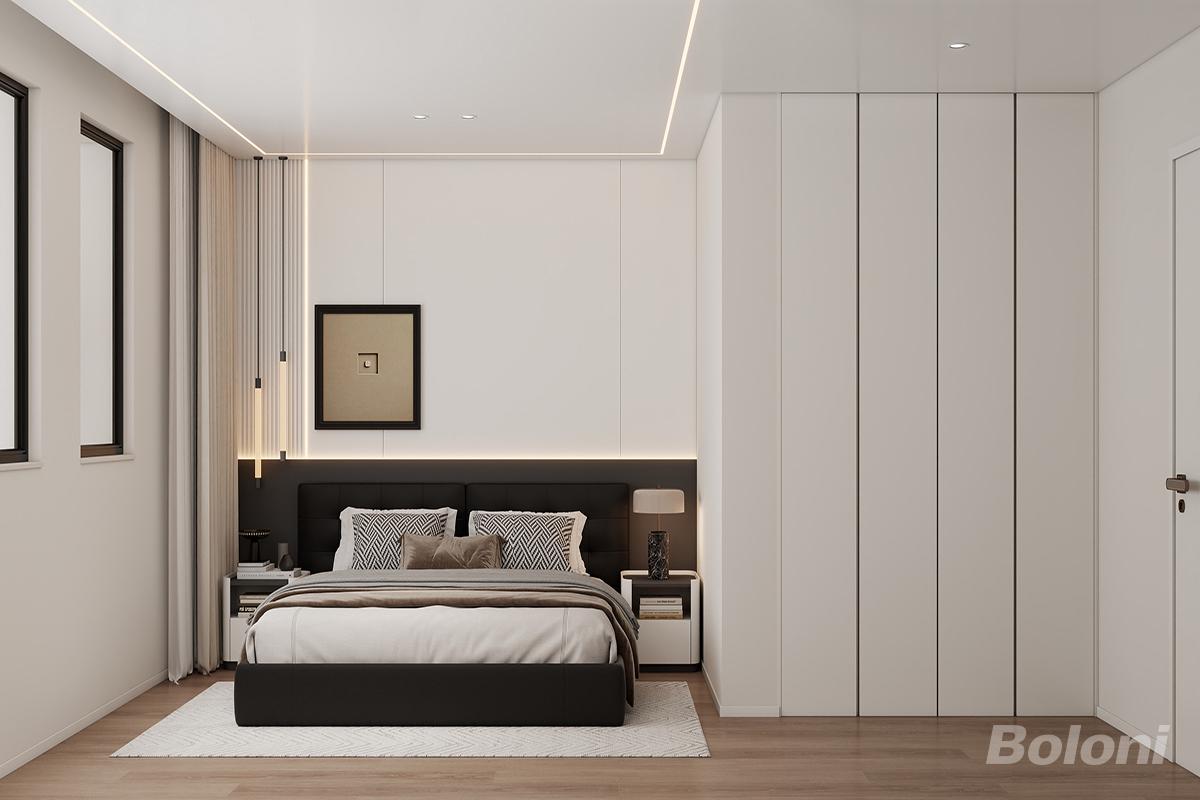 这是一个专为男主人打造的现代极简风格卧室,整体设计兼具沉稳气质与舒适体验,营造出既适合独处放松、又能彰显品味的私域空间。 以黑白灰为基底,深黑色软包床头作为视觉重心,搭配浅米白墙面与木色地板,用低饱和度的配色塑造出冷静、克制且高级的氛围。