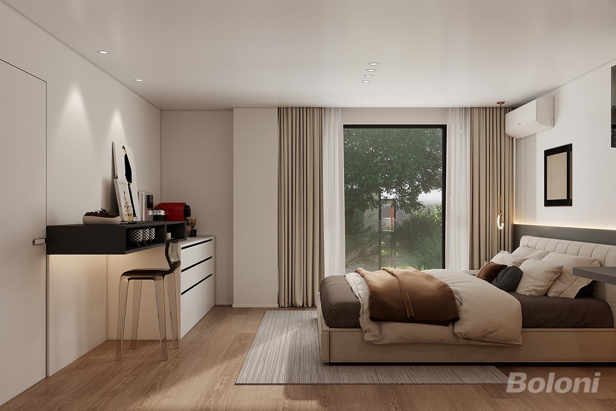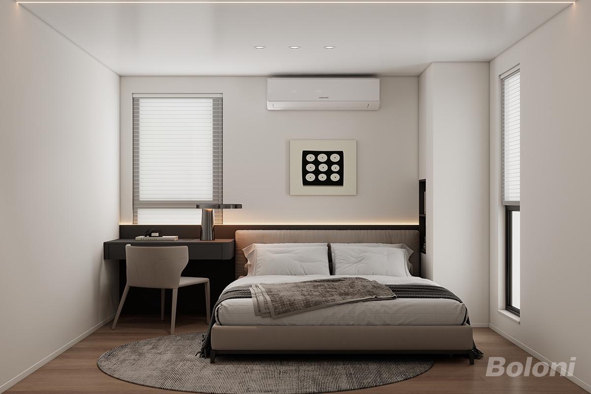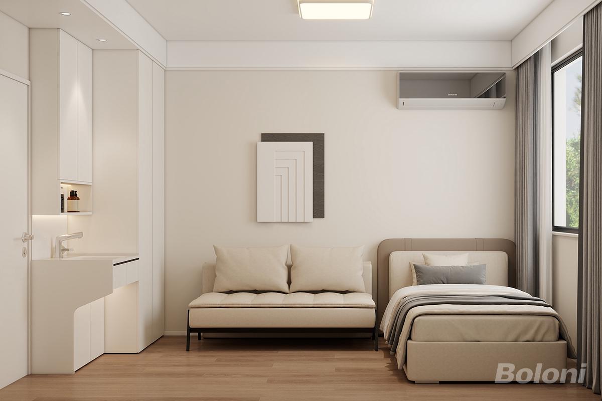 此空间为老人房,右侧的单人床采用浅米色软包床头,搭配同色系床品与灰色抱枕,营造出舒适放松的睡眠氛围。 床旁的双人沙发同样为浅米色,与床品色调统一,可供日常休憩或临时待客。 左侧集成了洗手台与收纳柜,悬空设计让空间更显轻盈,暗藏灯带既满足照明需求,又提升了整体精致感。 大面积的落地窗搭配浅灰色遮光窗帘,保证了充足的自然采光,同时也能灵活调节光线强度。