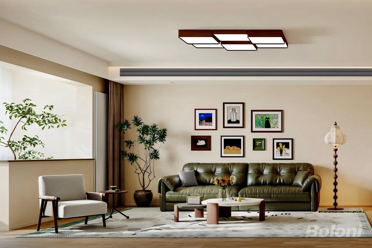 复古与现代融合的客厅设计 1.以深绿色复古皮沙发为视觉核心,搭配浅木色茶几与线条感单人椅,复古韵味与现代简约感平衡得恰到好处。 2.浅米色墙面 + 艺术感挂画组合,点缀绿植与复古落地灯,营造出温暖且充满层次的空间氛围。 3.木质几何吊灯与整体风格呼应,大窗引入自然光线,让整个空间舒适又充满生机。