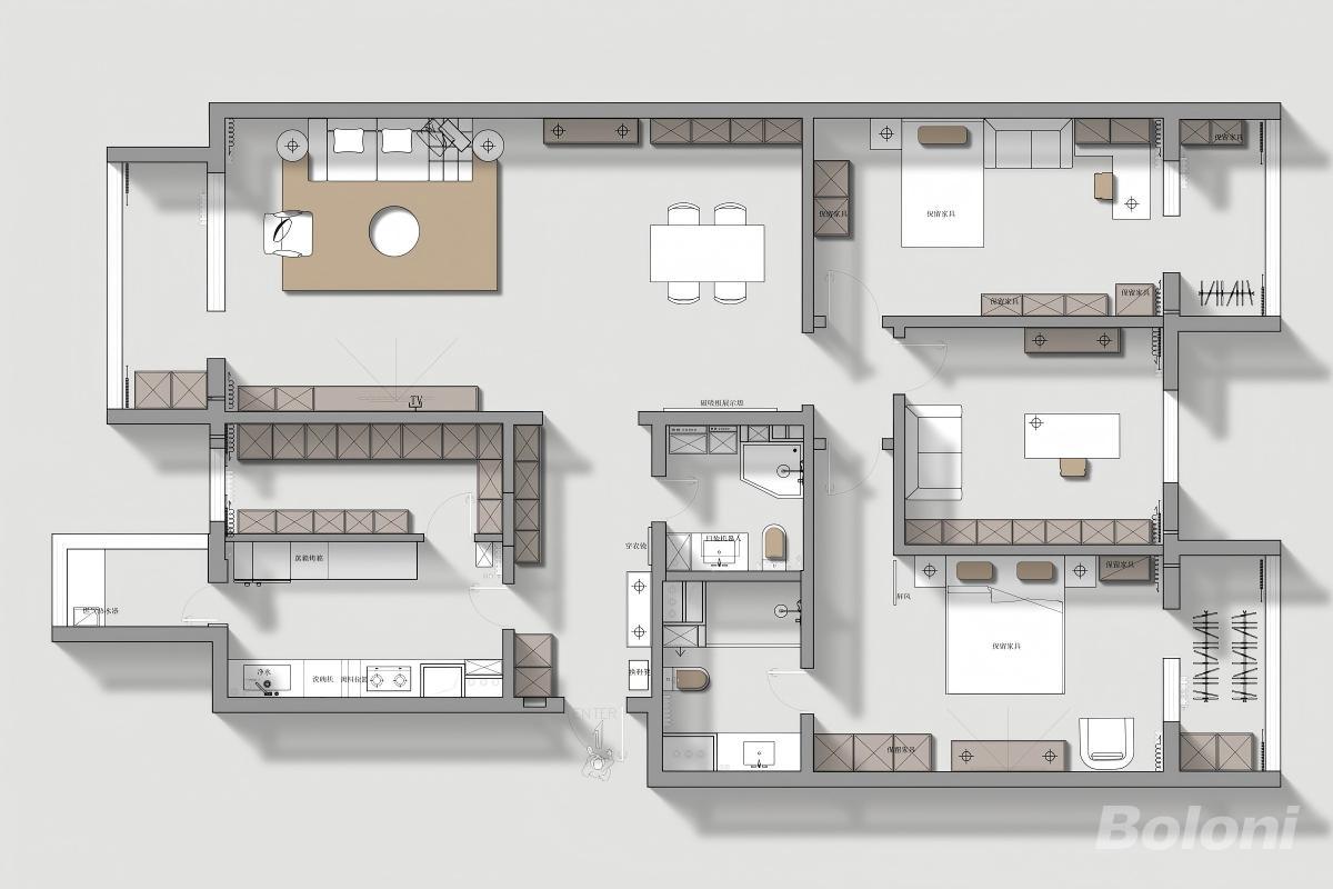 这个设计首先1.客餐厨一体化客厅、餐厅、开放式中岛厨房完全连通,形成一个超大的核心公共区,视觉上非常敞亮,家人互动、朋友聚会都能在开阔的空间里自然发生。2.无冗余动线:从厨房到餐厅再到客厅的行动路线短且顺畅3.功能分区清晰,动静分离,公共活动区(客餐厨)集中在户型左侧和中部保证了休息区的安静。