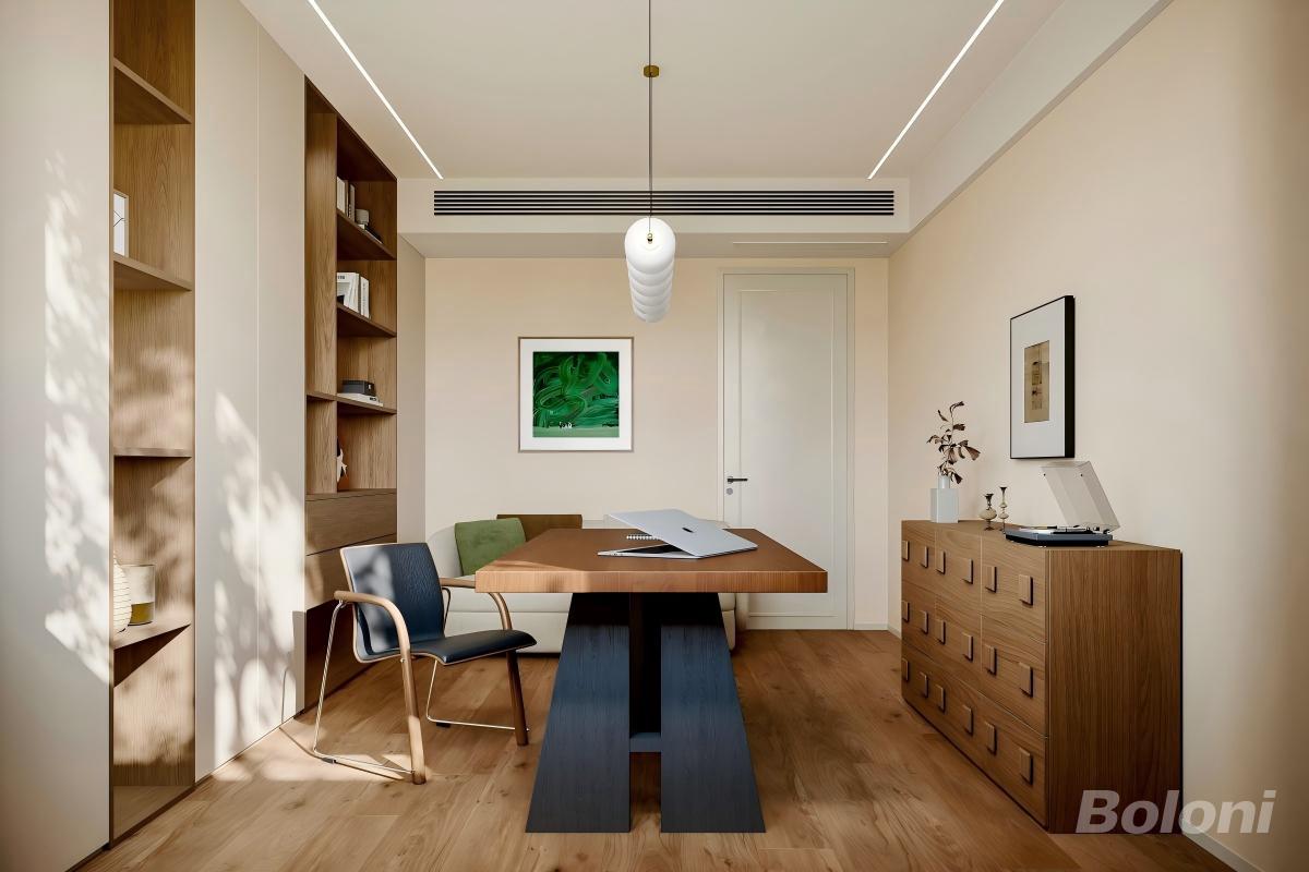 现代简约风的书房 1.以浅木色为基底,搭配深木色与黑色的家具,营造出沉稳又温暖的办公氛围。 2.左侧开放式书架与右侧多斗柜形成充足的收纳系统,书籍、杂物都能有序归置。 3.简约的白色吊灯与艺术挂画点缀空间,大窗引入的自然光线让整个空间通透明亮,既适合专注办公,也能作为小型洽谈区使用。