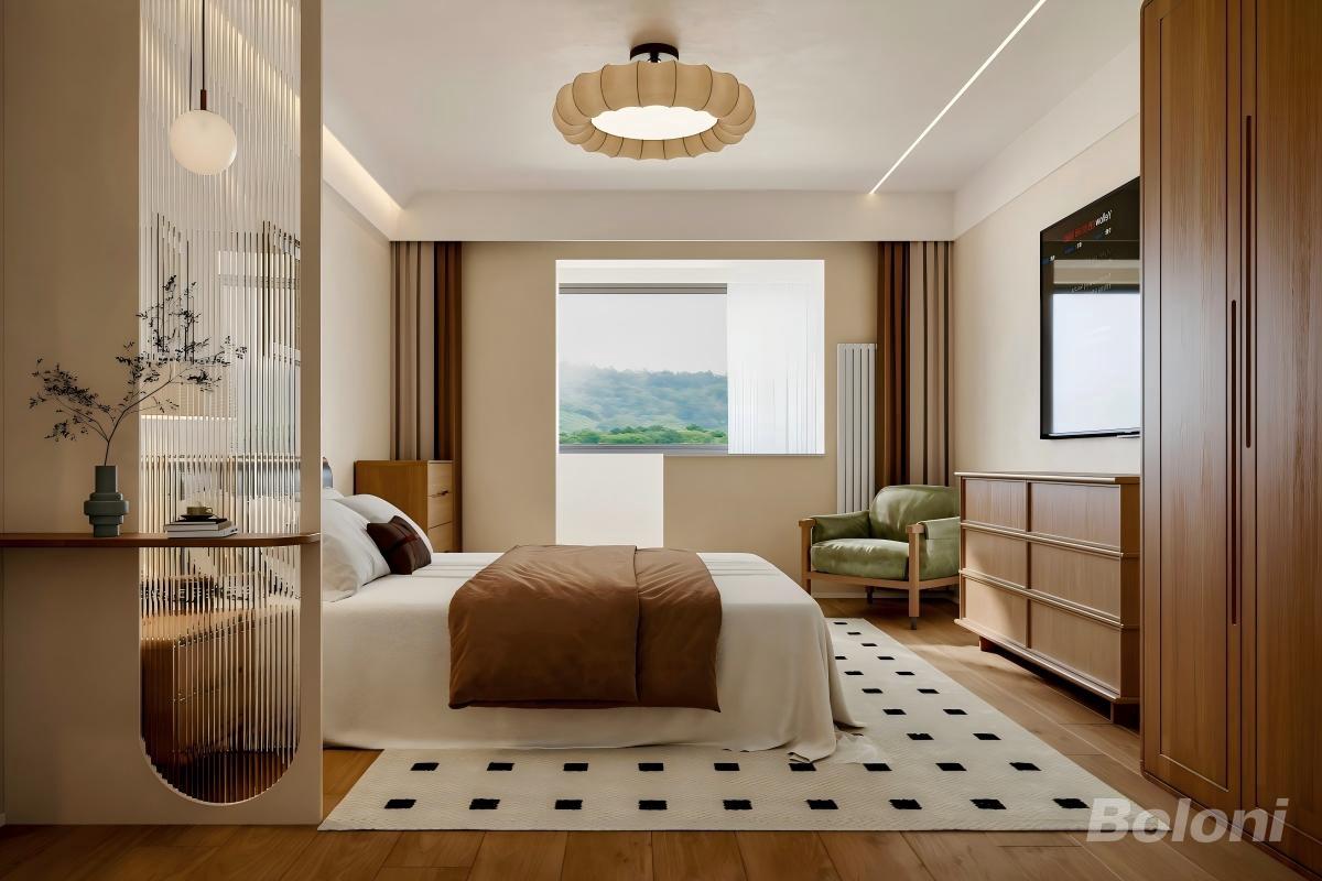 现代侘寂风与原木元素结合 1.以浅米色调为基底,搭配温润的原木家具,营造出柔和松弛的氛围。 2.长虹玻璃屏风做了巧妙的空间分区,既保证了通透感,又保留了隐私。 3.软装搭配克制且有质感:花瓣造型的吊灯增添柔美感,复古绿单人椅和波点地毯为空间注入活力,大窗则将户外绿意引入室内,让整个空间舒适又治愈。
