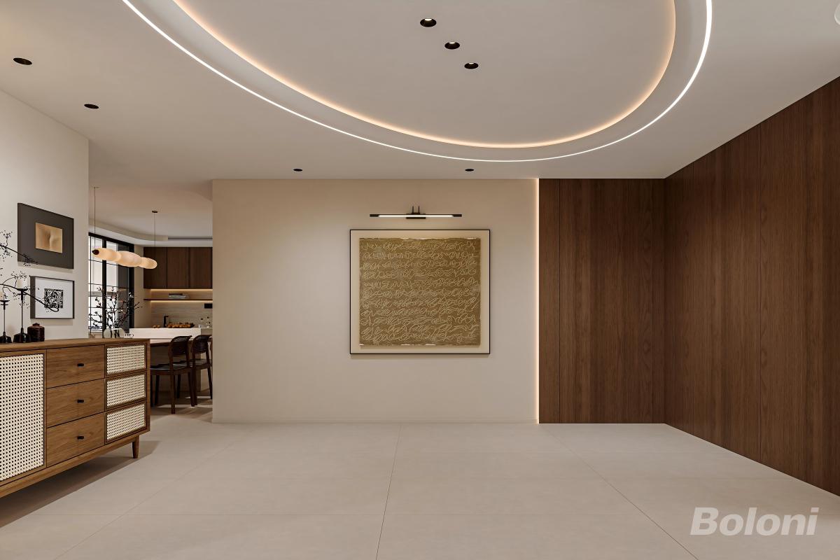 现代原木轻奢风格的入户端景区域,以柔白与温润木色为基底,借弧形灯光与艺术挂画营造雅致氛围,兼具空间过渡与装饰功能。