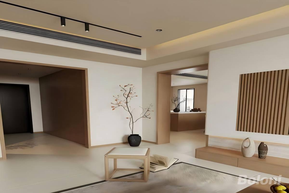 空间布局:采用开放式布局,将客厅与观景阳台相连,最大化引入自然光线,营造开阔通透的视觉感受。 材质与色彩:浅米色沙发搭配原木色茶几,地面铺设质感细腻的编织地毯,电视背景墙以木饰面与留白墙面结合,传递宋式 “素以为绚” 的美学特质。 细节亮点:无主灯设计配合线性灯带与磁吸轨道灯,营造层次丰富的柔和光影;定制木质收纳柜兼具展示与储物功能,让空间整洁有序。