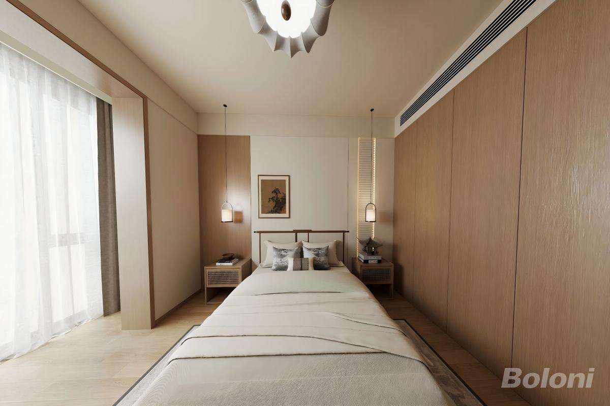 睡眠核心区:床体居中布局,两侧对称设置悬浮床头柜,保障动线流畅,契合宋代 “中正平和” 的空间哲学。 收纳系统:右侧整面木饰面暗藏通顶衣柜,无拉手设计维持视觉简洁性,满足储物需求的同时不破坏空间整体感。 采光与观景:左侧大面积落地窗搭配双层窗帘,既保障自然采光,又可通过纱帘营造 “半隐半透” 的朦胧意境,呼应宋式文人的含蓄审美。