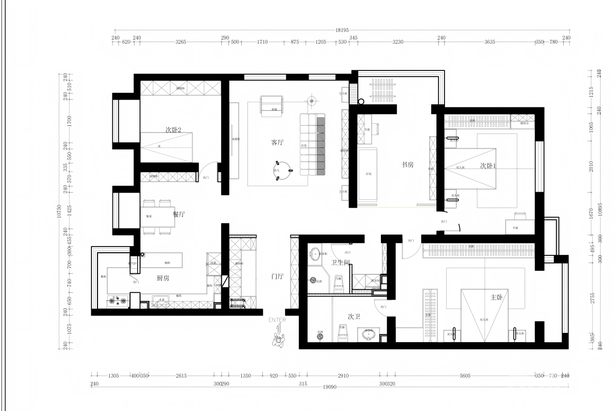 用 “动静分区” 布局:公共区域(客厅、餐厅、厨房)集中在西侧,私密区域(主卧、次卧、书房)分布在东侧,有效减少了家庭活动对休息区的干扰。 双卫生间设计:主卫与次卫分离,满足多成员家庭的同时使用需求,提升生活效率。