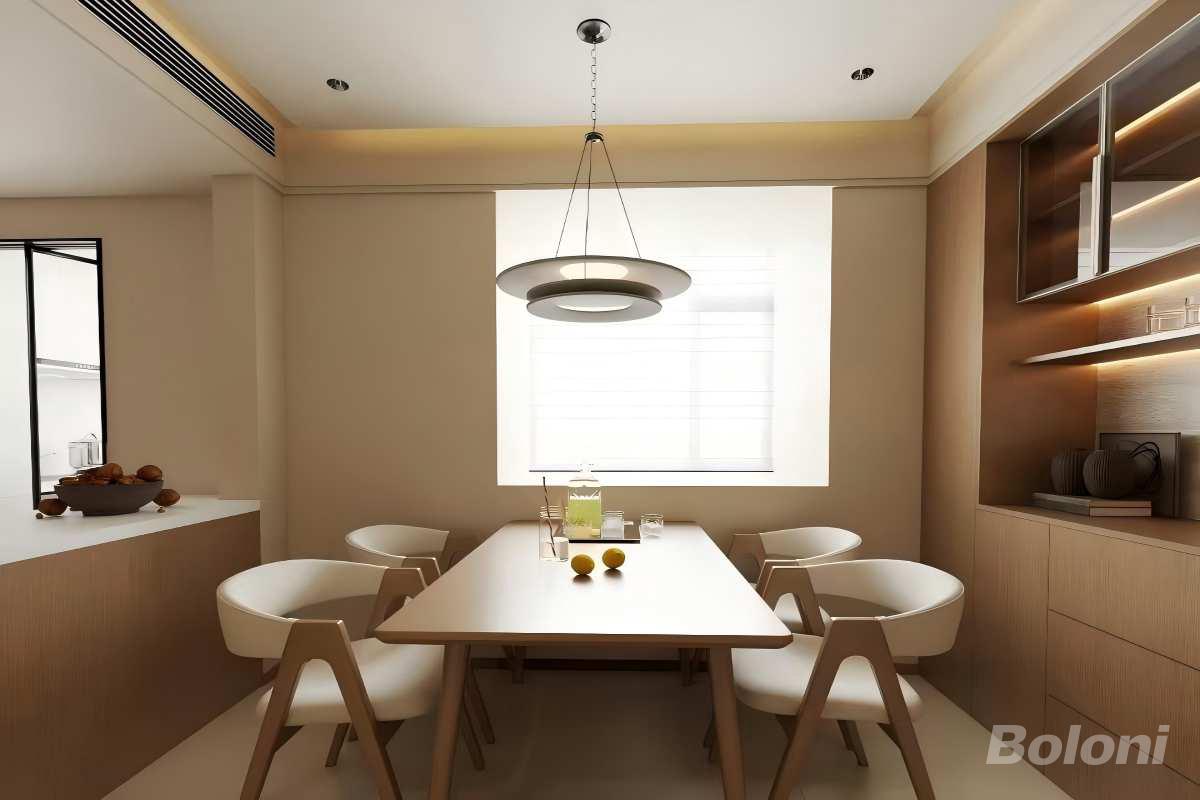 空间布局:紧邻厨房形成高效餐厨动线,六人位餐桌满足家庭聚餐需求,靠窗位置预留充足采光。 材质与色彩:选用北美橡木餐桌,搭配线条利落的木质餐椅,浅灰色墙面与木质柜面形成温润的色彩层次。 细节亮点:餐边柜结合开放格与封闭收纳,内嵌暖光灯带展示藏品;双层圆环吊灯呼应宋式器物的简约线条,提升空间精致感。