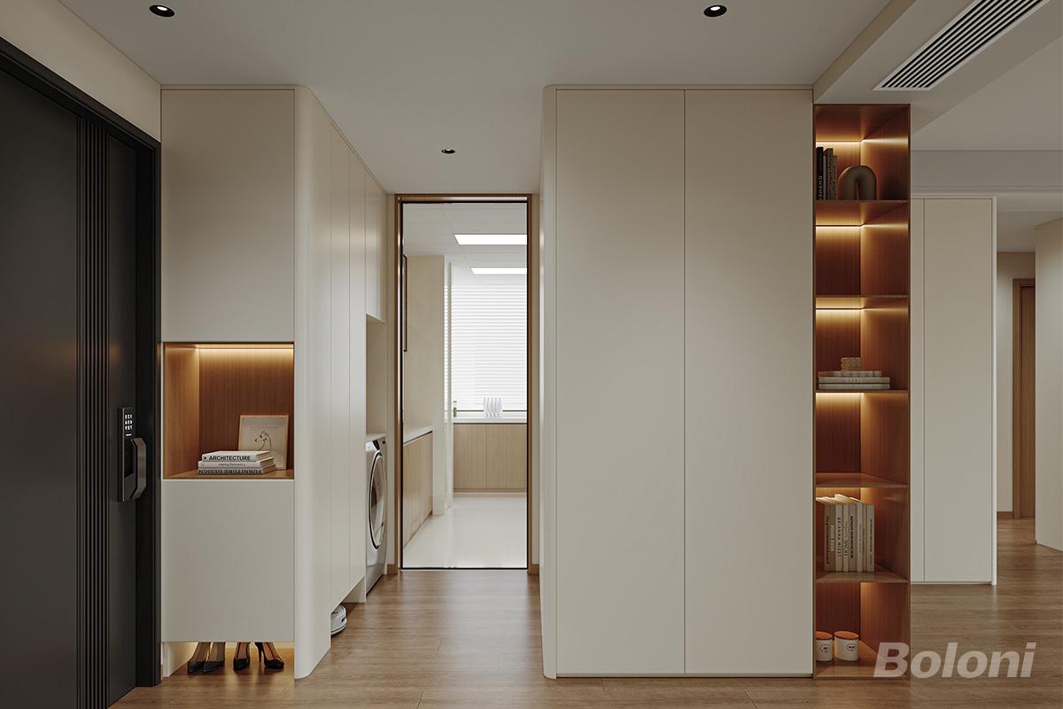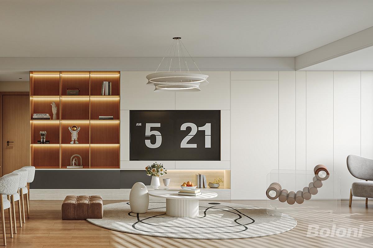 客厅电视墙则采用整面奶油色储物柜与局部开放式原木展架的组合,保持整洁,并且与主卧隐形门作为一个整体平面进行设计。将主卧入口完美隐藏,强化公共区域的整体感与私密区域的隐蔽性,提升空间趣味与高级感。