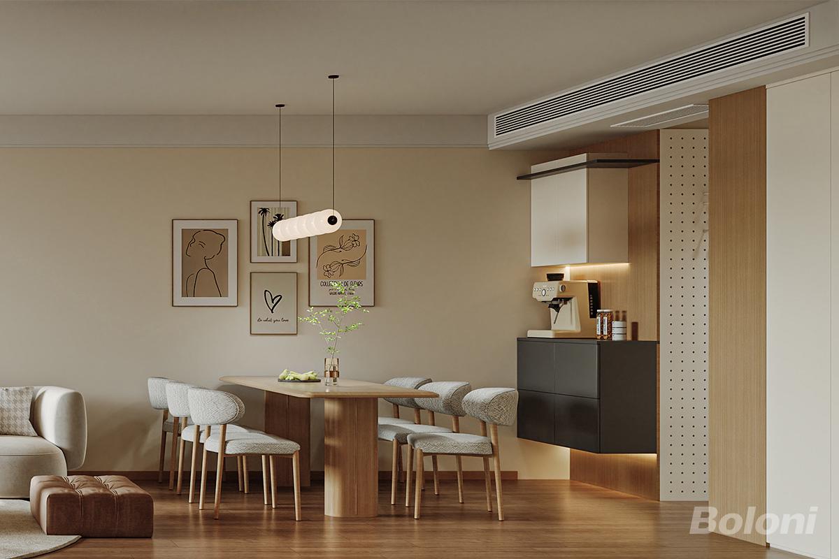 餐厅与客厅保持视觉连通,形成一体化布局。设置一张具有雕塑感的原木餐桌,桌腿设计为弧形,搭配同色系温莎椅。 定制整面餐边柜,中部镂空并嵌入线性灯带搭配层板,成为展示咖啡角、小电器的精致舞台。