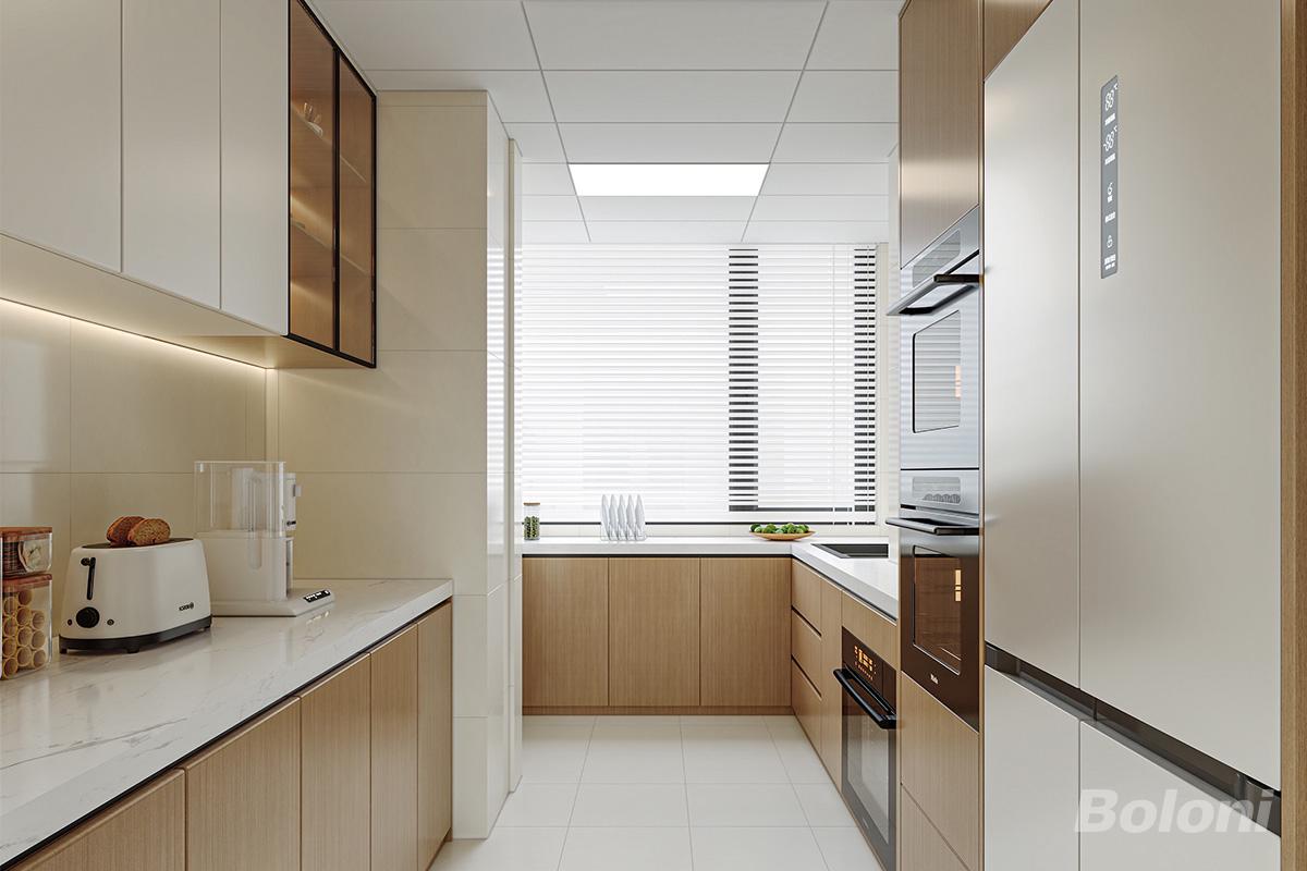 厨房橱柜采用上下分色设计,上柜为奶油色,下柜为橡木色,增加层次感。操作台面选用白色石英石,与墙面融为一体。配备大单槽、抽拉龙头。电器尽量嵌入式设计,保持台面空无一物。在吊柜下方、踢脚线处均嵌入感应灯带,确保操作明亮安全。