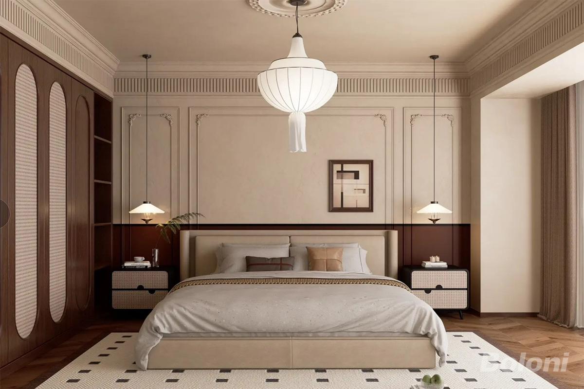 床头背景墙采用深色木饰面半墙设计,上半墙使用石膏线,划分了墙面空间,打破了整面墙的单调,视觉上提升层高,同时保护墙体。沿墙面定制整墙储物柜,柜门采用藤编柜门与实木平板门结合,增加透气感和材质变化。