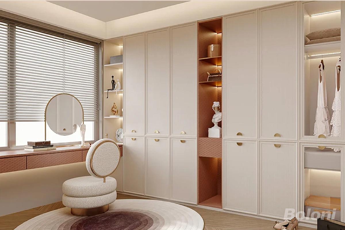衣帽间高效实用,同时作为中古服饰与配饰的展示空间。装轨道射灯提供均匀明亮的整体照明。设置一个中古梳妆台(带椭圆形镜子)和绒面矮凳。为包包、帽子预留开放式层板展示区,为长款衣物设置带黄铜杆的悬挂区。