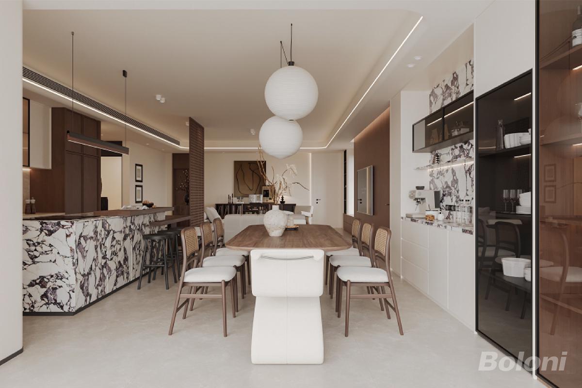 餐厅与厨房完全打通,形成流畅的回形动线。餐桌选择椭圆形实木餐桌,搭配不同款式的中古餐椅,实现餐厨完全互动,营造轻松愉悦的料理与用餐体验。