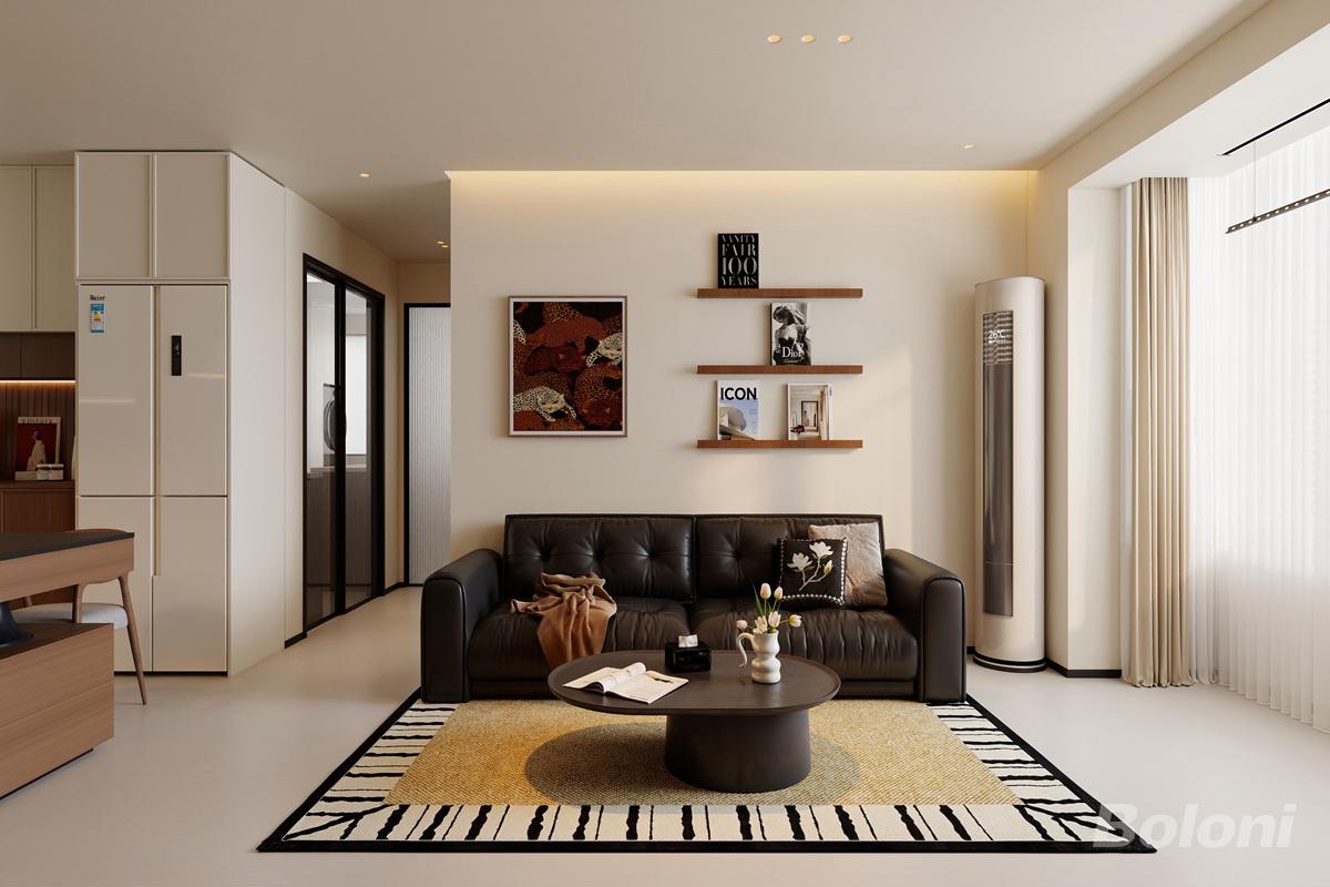 客厅以现代复古为核心,通过黑色皮质沙发、艺术挂画与层次置物架营造质感,柔和灯光与撞色地毯平衡冷硬,打造兼具复古氛围与当代舒适的松弛空间。