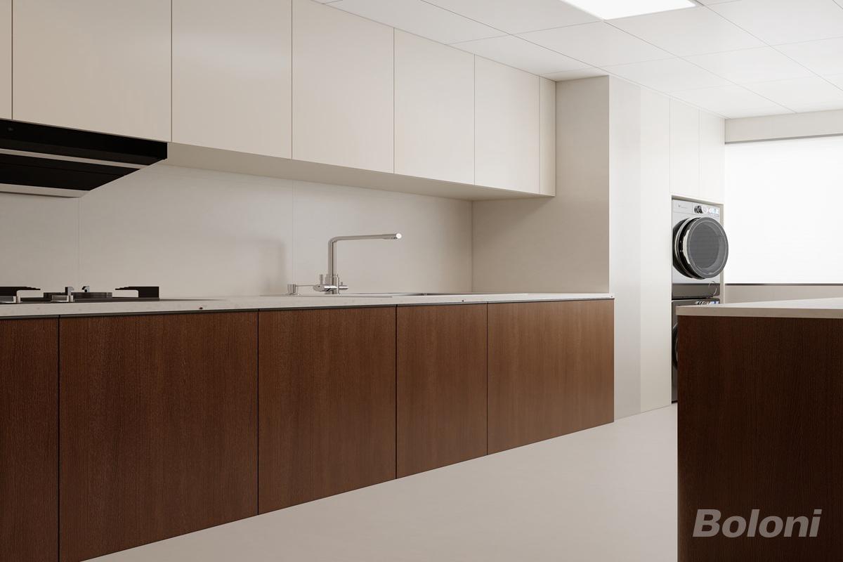 厨房采用现代简约风格,以深浅木色与白色柜体拼接,通过一体化台面与隐藏式收纳,打造兼具美学与实用性的高效备餐空间,开放式布局也强化了与公共区域的联动。