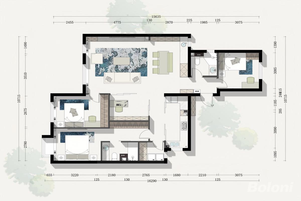 本设计聚焦“现代生活的高效与舒适”,将简约风格与实用主义深度结合。空间设计拒绝形式化装饰,以清晰的功能分区与流畅的动线规划为核心,让每一处空间都发挥最大价值。色彩搭配兼顾沉稳与活力,以深灰、浅灰构建基础调性,点缀少量亮色软装,打破单调,增添空间灵气。 材质方面,选用耐磨、易打理的现代材料,如岩板、复合地板、布艺等,兼顾实用性与质感表达。家具选型注重线条简洁与比例协调,造型大方且功能齐全。